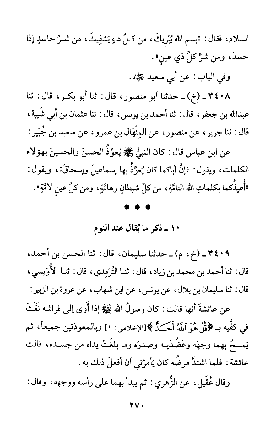 عن ابن عباس قال: كان النبي صلى الله عليه وسلم يعوذ الحسن والحسين بهؤلاء الكلمات، ويقول: ((إن أباكما كان يعوذ بها إسماعيل وإسحاق))، ويقول: ((أعيذكما بكلمات الله التامة، من كل شيطان وهامة، ومن كل عين لامة)).