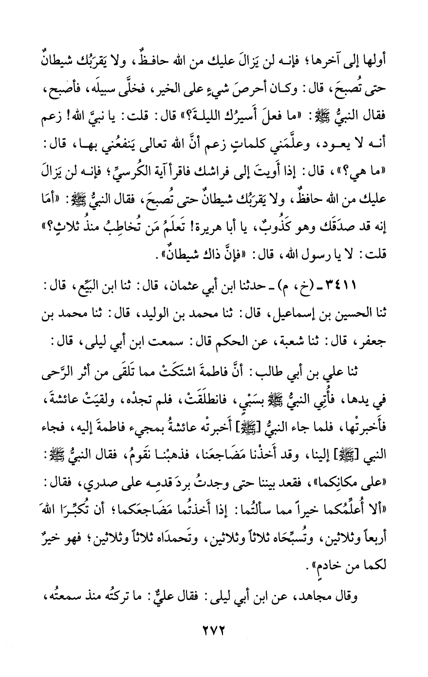 ثنا علي بن أبي طالب: أن فاطمة اشتكت مما تلقى من أثر الرحى في يدها، فأتي النبي صلى الله عليه وسلم بسبي، فانطلقت، فلم تجده، ولقيت عائشة، فأخبرتها، فلما جاء النبي [صلى الله عليه وسلم] أخبرته عائشة بمجيء فاطمة إليه، فجاء النبي [صلى الله عليه وسلم] إلينا، وقد أخذنا مضاجعنا، فذهبنا نقوم، فقال النبي صلى الله عليه وسلم: ((على مكانكما))، فقعد بيننا حتى وجدت برد قدمه على صدري، فقال: ((ألا أعلمكما خيرا مما سألتما: إذا أخذتما مضاجعكما؛ أن تكبرا الله أربعة وثلاثين، وتسبحاه ثلاثا وثلاثين، وتحمداه ثلاثا وثلاثين؛ فهو خير لكما من خادم)).
