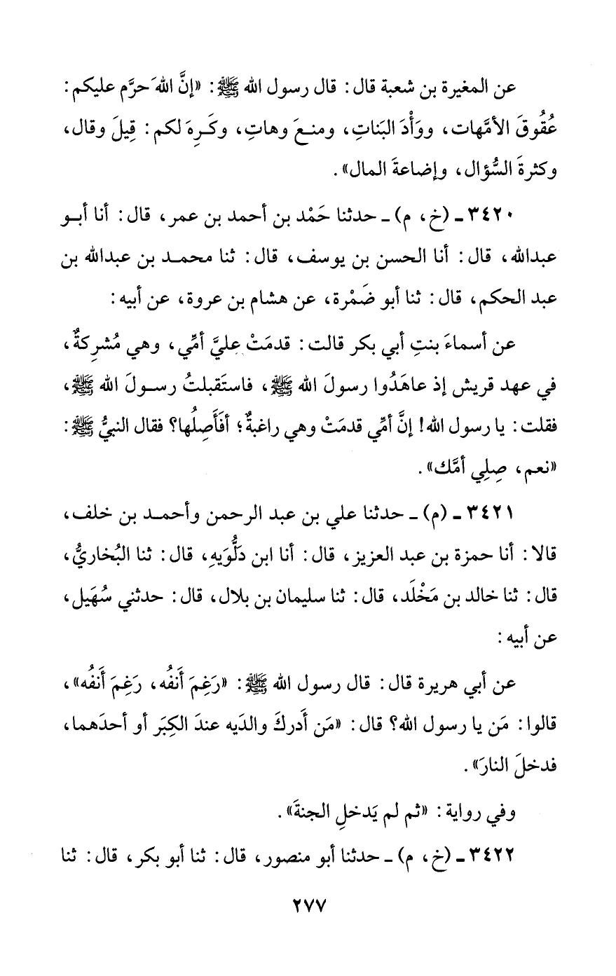 3420 - (خ، م) - حدثنا حمد بن أحمد بن عمر، قال: أنا أبو عبد الله، قال: أنا الحسن بن يوسف، قال: ثنا محمد بن عبد الله بن عبد الحكم، قال: ثنا أبو ضمرة، عن هشام بن عروة، عن أبيه: