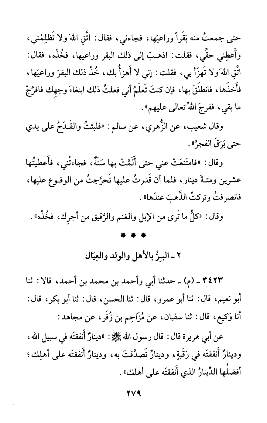 عن أبي هريرة قال: قال رسول الله صلى الله عليه وسلم: ((دينار أنفقته في سبيل الله، ودينار أنفقته في رقبة، ودينار تصدقت به، ودينار أنفقته على أهلك؛ أفضلها الدينار الذي أنفقته على أهلك)).