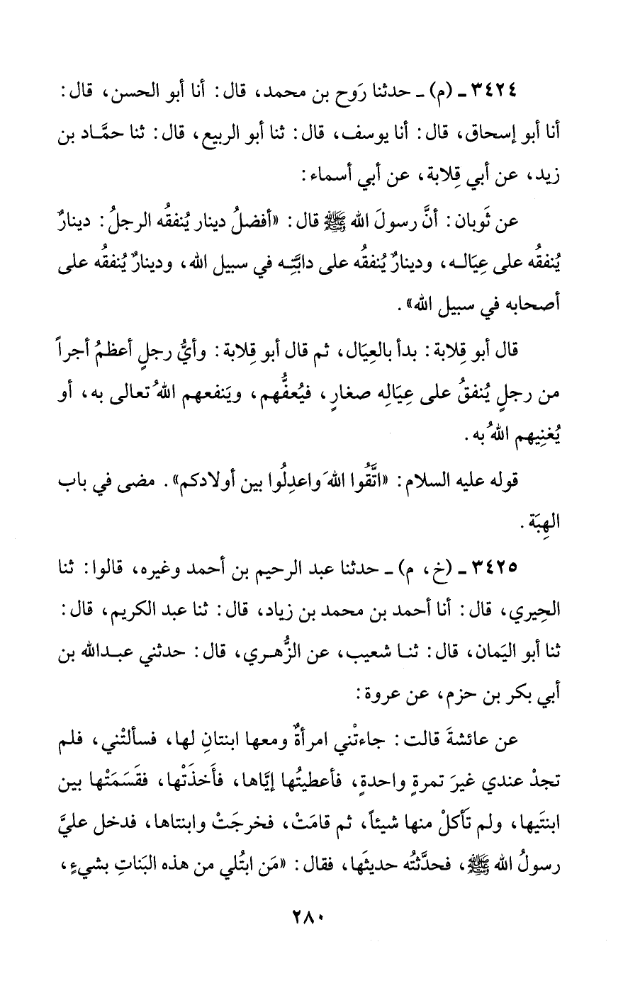 3425 - (خ، م) - حدثنا عبد الرحيم بن أحمد وغيره، قالوا: ثنا الحيري، قال: أنا أحمد بن محمد بن زياد، قال: ثنا عبد الكريم، قال: ثنا أبو اليمان، قال: ثنا شعيب، عن الزهري، قال: حدثني عبد الله بن أبي بكر بن حزم، عن عروة: