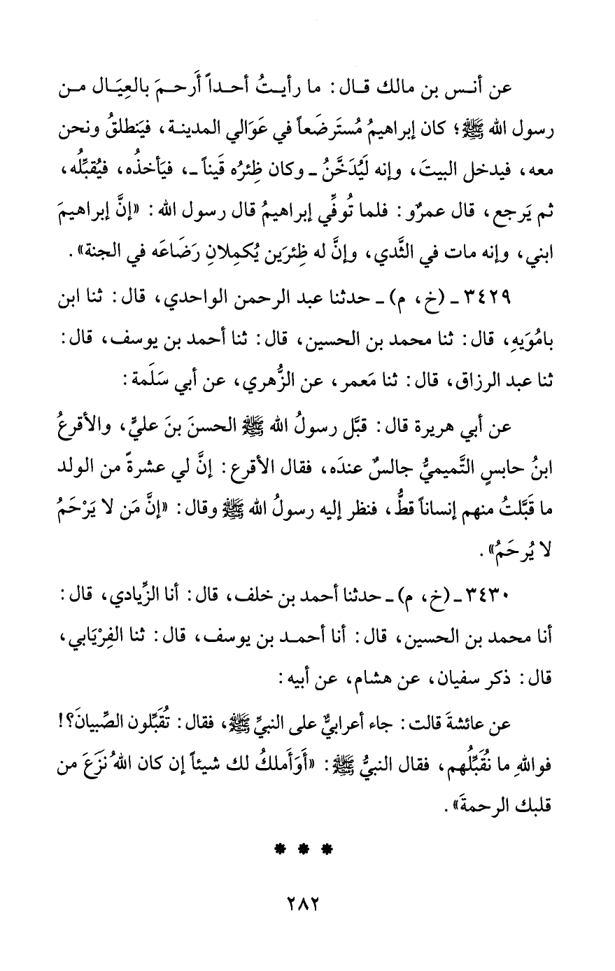 عن أبي هريرة قال: قبل رسول الله صلى الله عليه وسلم الحسن بن علي، والأقرع بن حابس التميمي جالس عنده، فقال الأقرع: إن لي عشرة من الولد ما قبلت منهم إنسانا قط، فنظر إليه رسول الله صلى الله عليه وسلم وقال: ((إن من لا يرحم لا يرحم)).