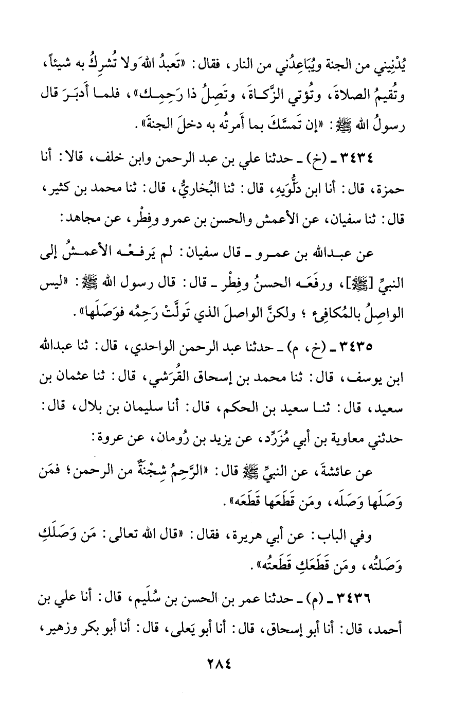 3435 - (خ، م) - حدثنا عبد الرحمن الواحدي، قال: ثنا عبد الله بن يوسف، قال: ثنا محمد بن إسحاق القرشي، قال: ثنا عثمان بن سعيد، قال: ثنا سعيد بن الحكم، قال: أنا سليمان بن بلال، قال: حدثني معاوية بن أبي مزرد، عن يزيد بن رومان، عن عروة؛