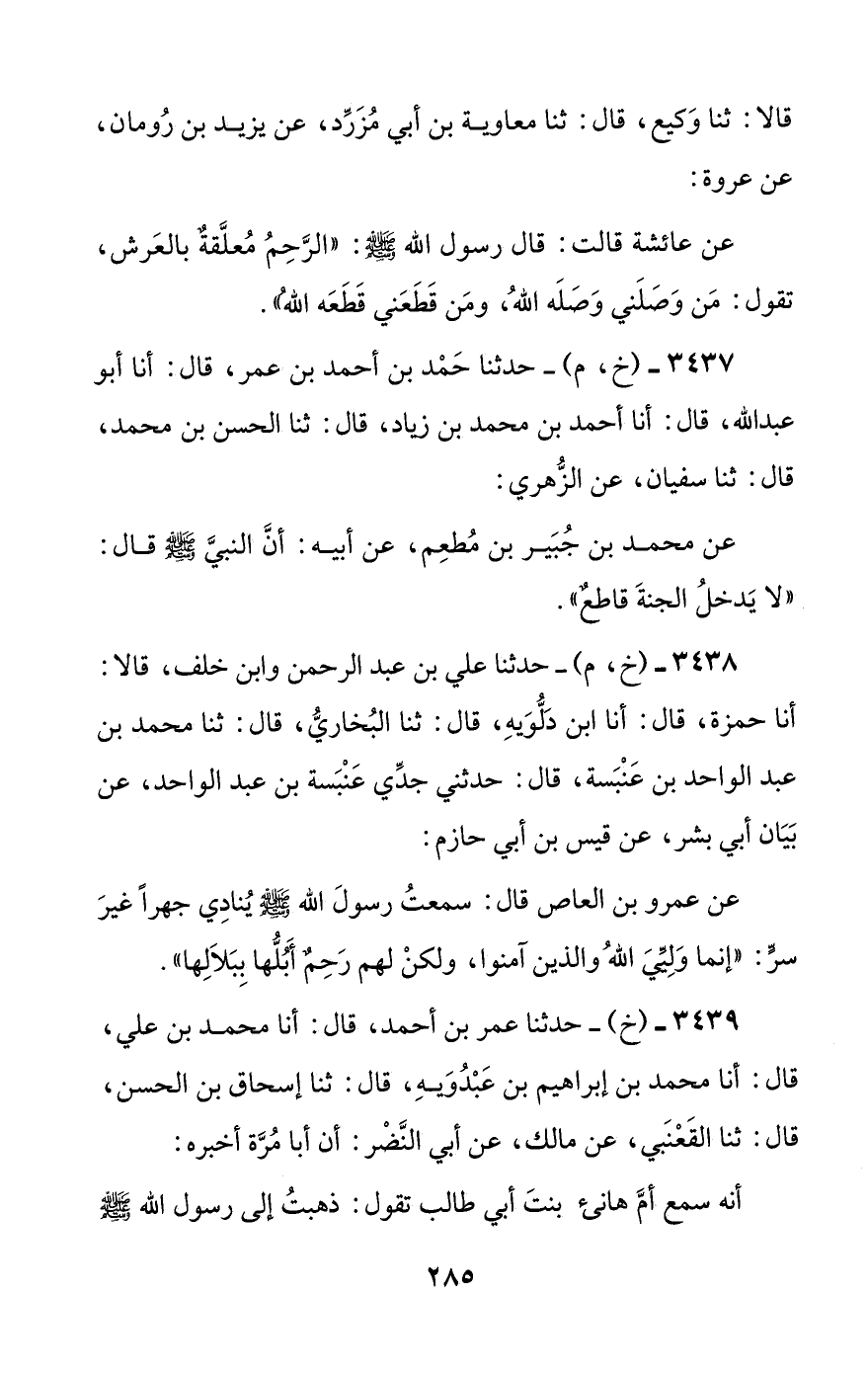 عن محمد بن جبير بن مطعم، عن أبيه: أن النبي صلى الله عليه وسلم قال: ((لا يدخل الجنة قاطع)).