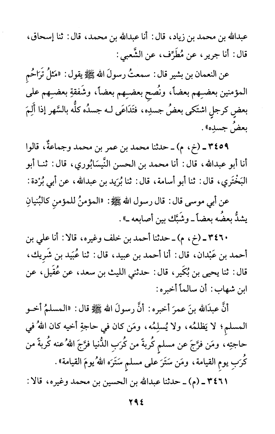3459 - (خ، م) - حدثنا محمد بن عمر بن محمد وجماعة، قالوا أنا أبو عبد الله، قال: أنا محمد بن الحسن النيسابوري، قال: ثنا أبو البختري، قال: ثنا أبو أسامة، قال: ثنا بريد بن عبد الله، عن أبي بردة:
