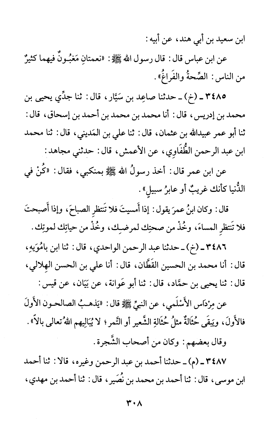 3485 - (خ) - حدثنا صاعد بن سيار، قال: ثنا جدي يحيى بن محمد بن إدريس، قال: أنا محمد بن محمد بن أحمد بن إسحاق، قال: ثنا أبو عمر عبيد الله بن عثمان، قال: ثنا علي بن المديني، قال: ثنا محمد بن عبد الرحمن الطفاوي، عن الأعمش، قال: حدثني مجاهد: