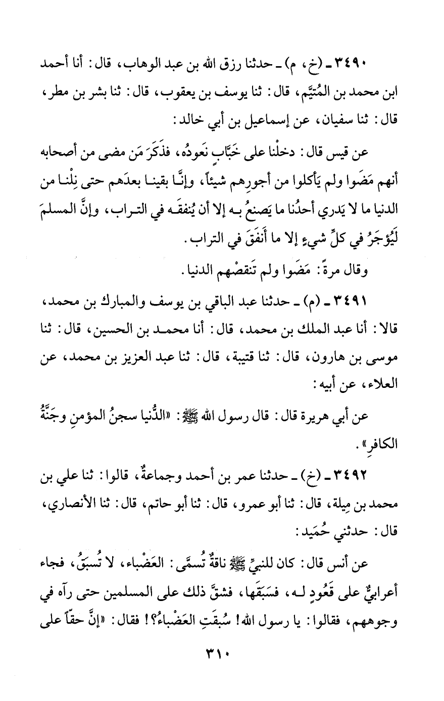 3490 - (خ، م) - حدثنا رزق الله بن عبد الوهاب، قال: أنا أحمد بن محمد بن المتيم، قال: ثنا يوسف بن يعقوب، قال: ثنا بشر بن مطر، قال: ثنا سفيان، عن إسماعيل بن أبي خالد: