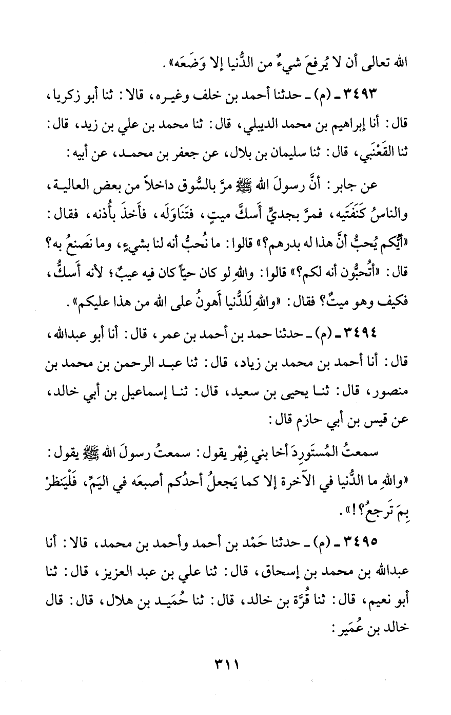 3494 - (م) - حدثنا حمد بن أحمد بن عمر، قال: أنا أبو عبد الله، قال: أنا أحمد بن محمد بن زياد، قال: ثنا عبد الرحمن بن محمد بن منصور، قال: ثنا يحيى بن سعيد، قال: ثنا إسماعيل بن أبي خالد، عن قيس بن أبي حازم قال: