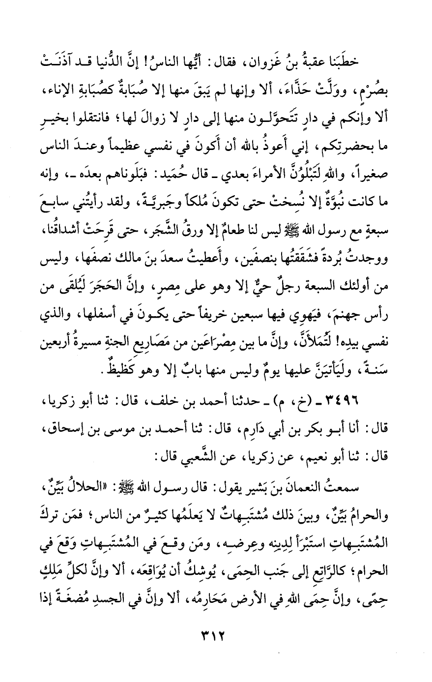سمعت النعمان بن بشير يقول: قال رسول الله صلى الله عليه وسلم: ((الحلال بين، والحرام بين، وبين ذلك مشتبهات لا يعلمها كثير من الناس؛ فمن ترك المشتبهات استبرأ لدينه وعرضه، ومن وقع في المشتبهات وقع في الحرام؛ كالراتع إلى جنب الحمى، يوشك أن يواقعه، ألا وإن لكل ملك حمى، وإن حمى الله في الأرض محارمه، ألا وإن في الجسد مضغة إذا #313# صلحت صلح الجسد، وإذا فسدت فسد سائر الجسد؛ ألا وهي القلب)).