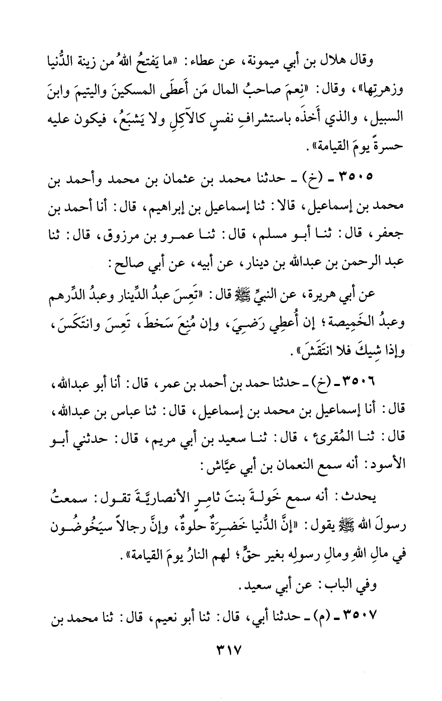 3505 - (خ) - حدثنا محمد بن عثمان بن محمد وأحمد بن محمد بن إسماعيل، قالا: ثنا إسماعيل بن إبراهيم، قال: أنا أحمد بن جعفر، قال: ثنا أبو مسلم، قال: ثنا عمرو بن مرزوق، قال: ثنا عبد الرحمن بن عبد الله بن دينار، عن أبيه، عن أبي صالح: