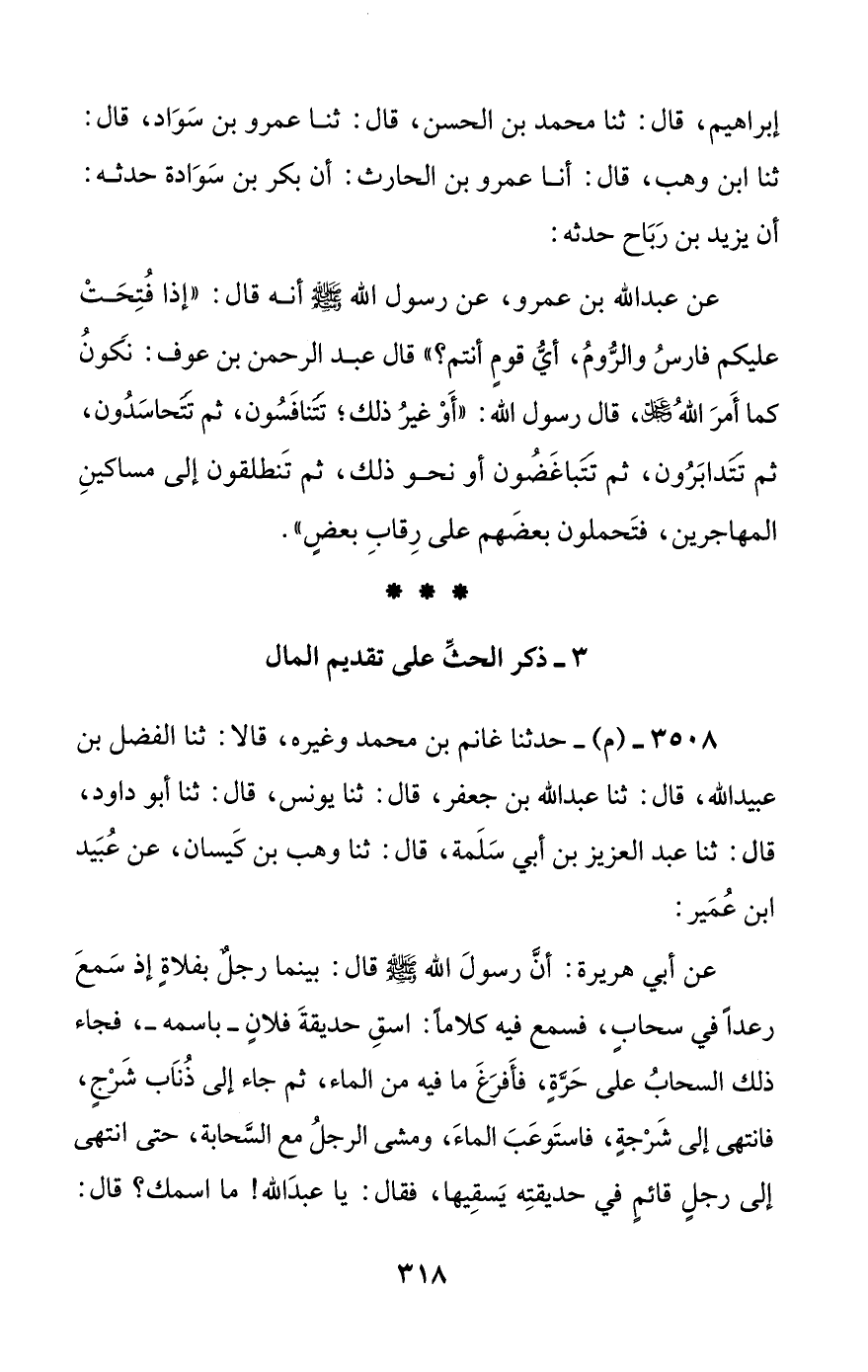 عن أبي هريرة: أن رسول الله صلى الله عليه وسلم قال: بينما رجل بفلاة إذ سمع رعدا في سحاب، فسمع فيه كلاما: اسق حديقة فلان -باسمه-، فجاء ذلك السحاب على حرة، فأفرغ ما فيه من الماء، ثم جاء إلى ذناب شرج، فانتهى إلى شرجة، فاستوعب الماء، ومشى الرجل مع السحابة، حتى انتهى إلى رجل قائم في حديقته يسقيها، فقال: يا عبد الله! ما اسمك؟ قال: #319# ولم تسأل؟ أنا فلان، قال: ما تصنع في حديقتك هذه؟ قال: ولم تسأل؟ قال: إني سمعت من سحاب هذا ماؤه: اسق حديقة فلان -باسمك-، فما تصنع فيها إذا صرمتها؟ قال: أما إذ قلت ذلك فإني أجعله على ثلاثة أثلاث، أجعل ثلثا لي ولأهلي، وأرد ثلثا فيها، وأجعل ثلثا في المساكين والسائلين وابن السبيل.