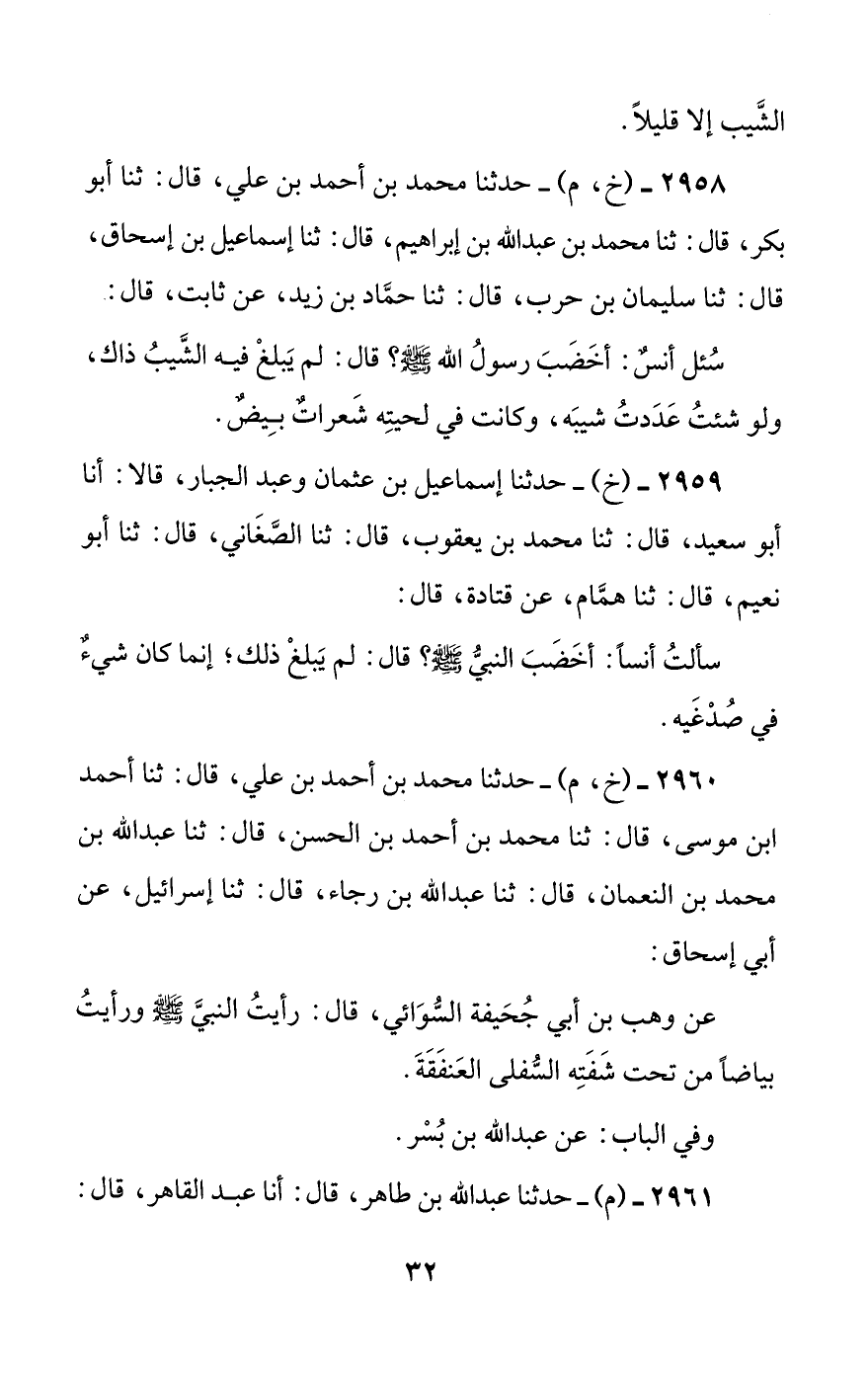 2958 - (خ، م) - حدثنا محمد بن أحمد بن علي، قال: ثنا أبو بكر، قال: ثنا محمد بن عبد الله بن إبراهيم، قال ثنا إسماعيل بن إسحاق، قال: ثنا سليمان بن حرب، قال: ثنا حماد بن زيد، عن ثابت، قال: