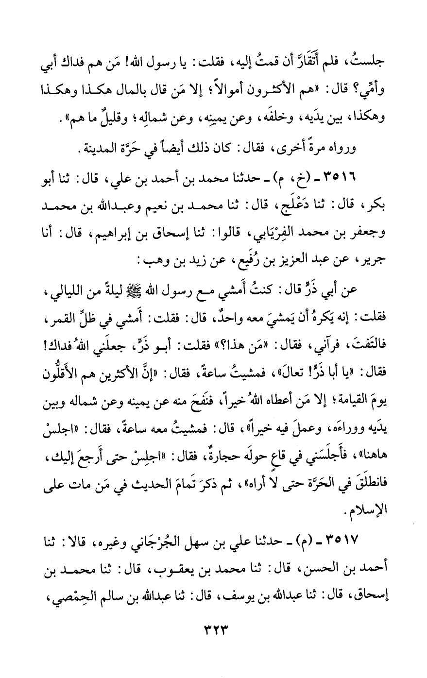 عن أبي ذر قال: كنت أمشي مع رسول الله صلى الله عليه وسلم ليلة من الليالي، فقلت: إنه يكره أن يمشي معه واحد، قال: فقلت: أمشي في ظل القمر، فالتفت، فرآني، فقال: ((من هذا؟)) فقلت: أبو ذر، جعلني الله فداك! فقال: ((يا أبا ذر! تعال))، فمشيت ساعة، فقال: ((إن الأكثرين هم الأقلون يوم القيامة؛ إلا من أعطاه الله خيرا، فنفح منه عن يمينه وعن شماله وبين يديه ووراءه، وعمل فيه خيرا))، قال: فمشيت معه ساعة، فقال: ((اجلس هاهنا))، فأجلسني في قاع حوله حجارة، فقال: ((اجلس حتى أرجع إليك، فانطلق في الحرة حتى لا أراه))، ثم ذكر تمام الحديث في من مات على الإسلام.