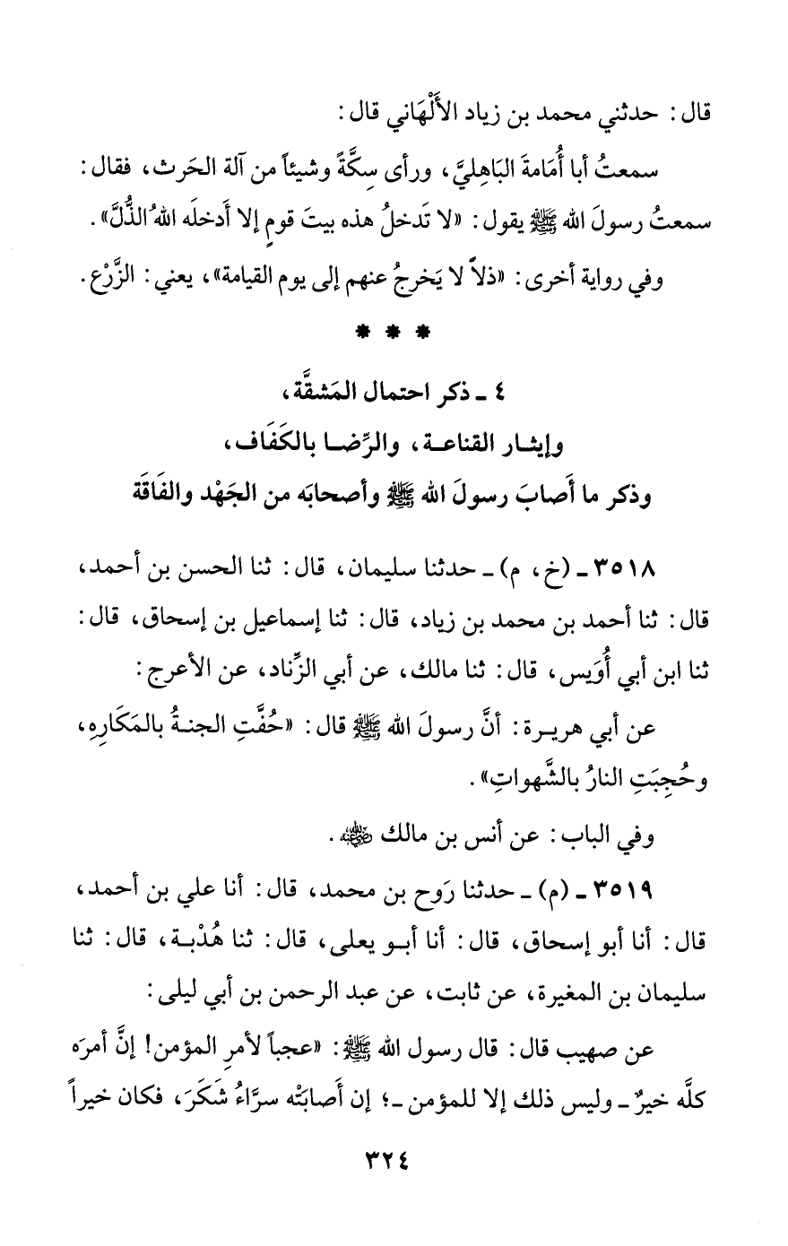 [4] ذكر احتمال المشقة، وإيثار القناعة، والرضا بالكفاف، وذكر ما أصاب رسول الله صلى الله عليه وسلم وأصحابه من الجهد والفاقة