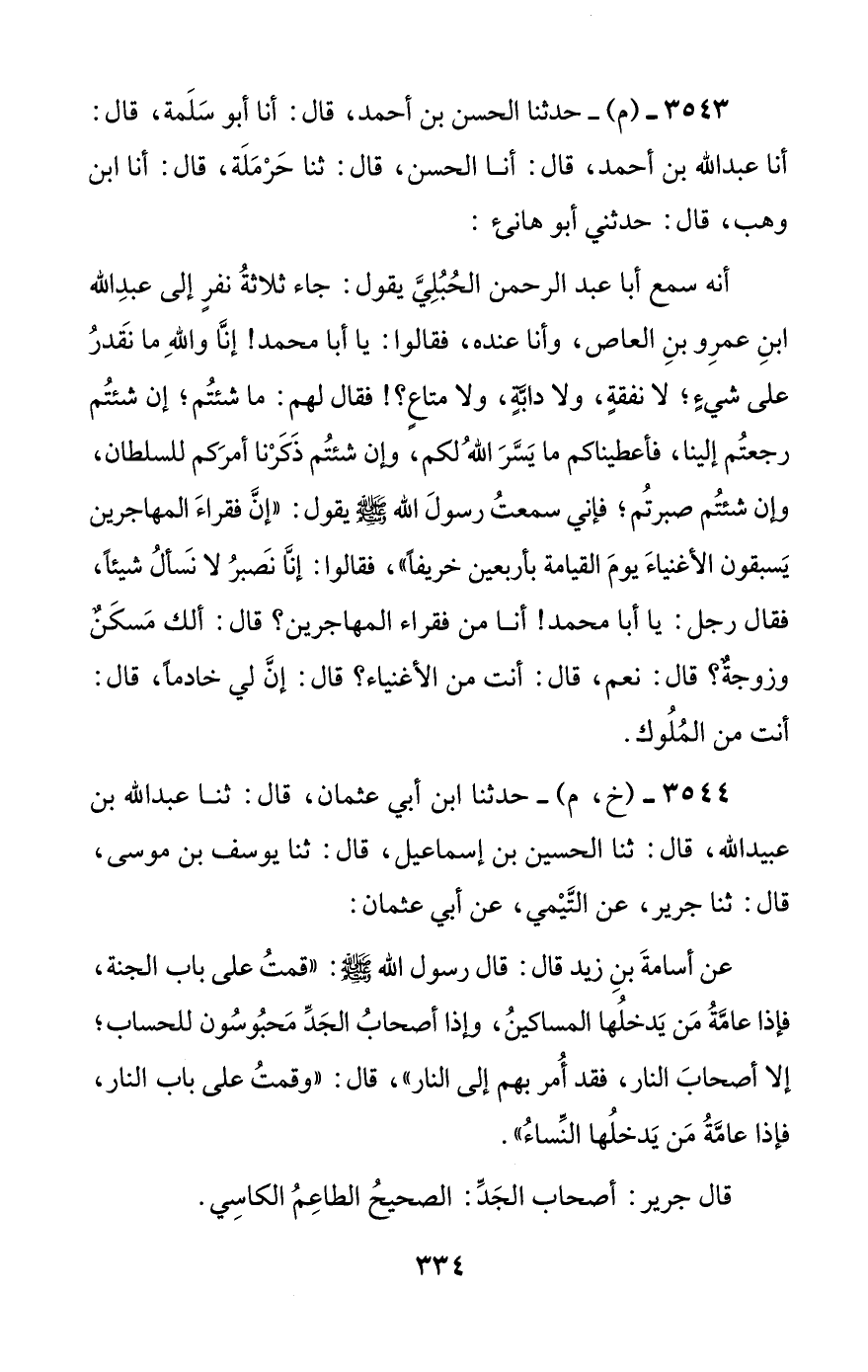 3544 - (خ، م) - حدثنا ابن أبي عثمان، قال: ثنا عبد الله بن عبيد الله، قال: ثنا الحسين بن إسماعيل، قال: ثنا يوسف بن موسى، قال: ثنا جرير، عن التيمي، عن أبي عثمان: