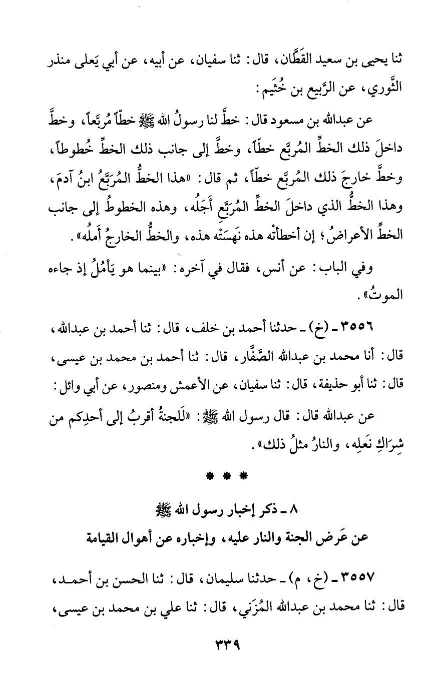 عن عبد الله قال: قال رسول الله صلى الله عليه وسلم: ((للجنة أقرب إلى أحدكم من شراك نعله، والنار مثل ذلك)).