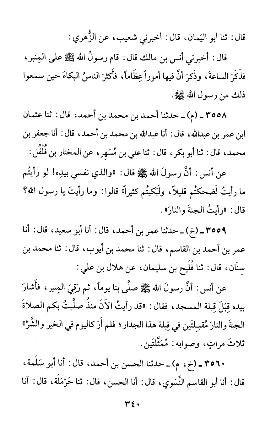 عن أنس: أن رسول الله صلى الله عليه وسلم قال: ((والذي نفسي بيده! لو رأيتم ما رأيت لضحكتم قليلا، ولبكيتم كثيرا)) قالوا: وما رأيت يا رسول الله؟ قال: ((رأيت الجنة والنار)).
