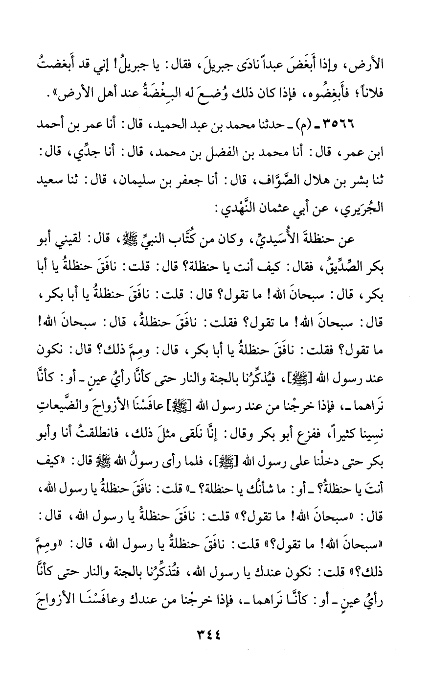 عن حنظلة الأسيدي، وكان من كتاب النبي صلى الله عليه وسلم، قال: لقيني أبو بكر الصديق، فقال: كيف أنت يا حنظلة؟ قال: قلت: نافق حنظلة يا أبا بكر، قال: سبحان الله! ما تقول؟ قال: قلت: نافق حنظلة يا أبا بكر، قال: سبحان الله! ما تقول؟ فقلت: نافق حنظلة، قال: سبحان الله! ما تقول؟ فقلت: نافق حنظلة يا أبا بكر، قال: ومم ذلك؟ قال: نكون عند رسول الله [صلى الله عليه وسلم]، فيذكرنا بالجنة والنار حتى كأنا رأي عين -أو: كأنا نراهما-، فإذا خرجنا من عند رسول الله [صلى الله عليه وسلم] عافسنا الأزواج والضيعات نسينا كثيرا، ففزع أبو بكر وقال: إنا نلقى مثل ذلك، فانطلقت أنا وأبو بكر حتى دخلنا على رسول الله [صلى الله عليه وسلم]، فلما رأى رسول الله صلى الله عليه وسلم قال: ((كيف أنت يا حنظلة؟ -أو: ما شأنك يا حنظلة؟ -)) قلت: نافق حنظلة يا رسول الله، قال: ((سبحان الله! ما تقول؟)) قلت: نافق حنظلة يا رسول الله، قال: ((سبحان الله! ما تقول؟)) قلت: نافق حنظلة يا رسول الله، قال: ((ومم ذلك؟)) قلت: نكون عندك يا رسول الله، فتذكرنا بالجنة والنار حتى كأنا رأي عين -أو: كأنا نراهما-، فإذا خرجنا من عندك وعافسنا الأزواج #345# والأولاد والضيعات نسينا كثيرا، فقال رسول الله: ((والذي نفسي بيده! لو تدومون على ما تكونون عندي في الذكر لصافحتكم الملائكة على فرشكم وفي طرقكم، ولكن يا حنظلة ساعة وساعة)).