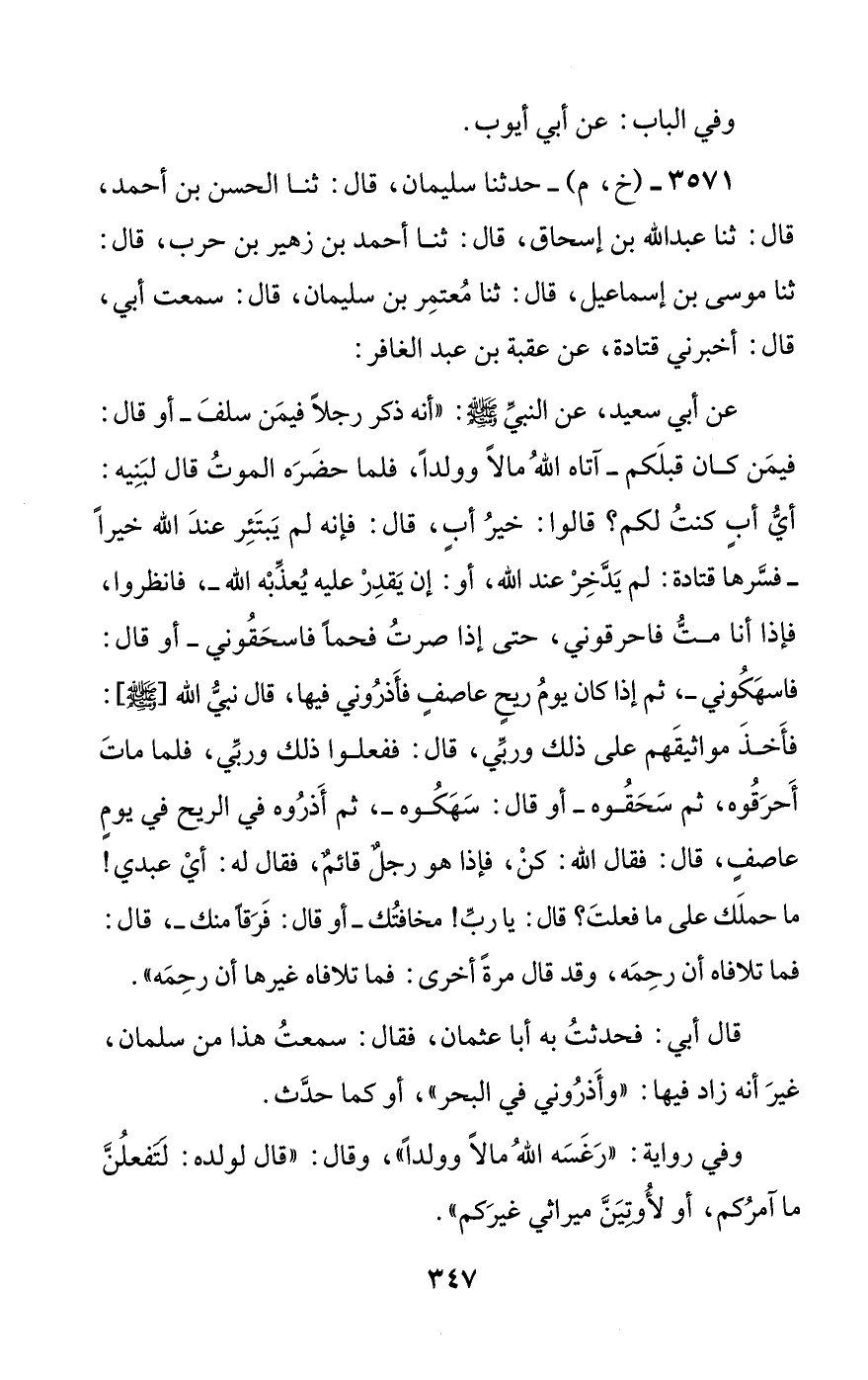 3571 - (خ، م) - حدثنا سليمان، قال: ثنا الحسن بن أحمد، قال: ثنا عبد الله بن إسحاق، قال: ثنا أحمد بن زهير بن حرب، قال: ثنا موسى بن إسماعيل، قال: ثنا معتمر بن سليمان، قال: سمعت أبي، قال: أخبرني قتادة، عن عقبة بن عبد الغافر: