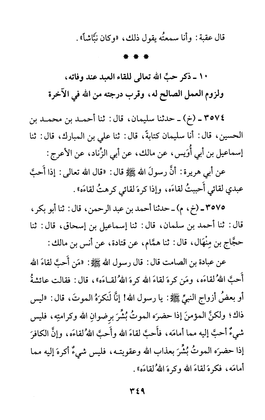 [10] ذكر حب الله تعالى للقاء العبد عند وفاته، ولزوم العمل الصالح له، وقرب درجته من الله في الآخرة