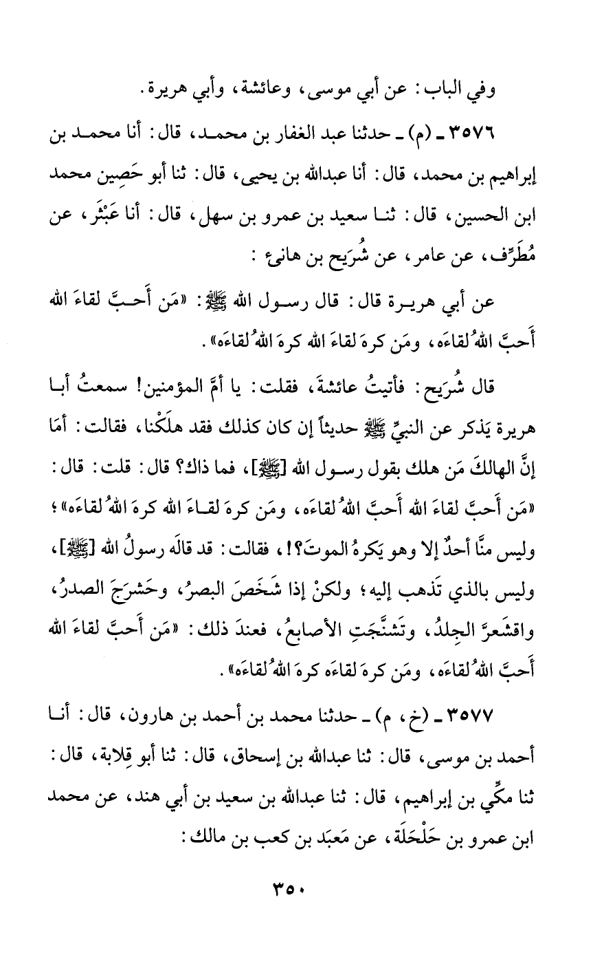 قال شريح: فأتيت عائشة، فقلت: يا أم المؤمنين! سمعت أبا هريرة يذكر عن النبي صلى الله عليه وسلم حديثا إن كان كذلك فقد هلكنا، فقالت: أما إن الهالك من هلك بقول رسول الله [صلى الله عليه وسلم]، فما ذاك؟ قال: قلت: قال: ((من أحب لقاء الله أحب الله لقاءه، ومن كره لقاء الله كره الله لقاءه))؛ وليس منا أحد إلا وهو يكره الموت؟! فقالت: قد قاله رسول الله [صلى الله عليه وسلم]، وليس بالذي تذهب إليه؛ ولكن إذا شخص البصر، وحشرج الصدر، واقشعر الجلد، وتشنجت الأصابع، فعند ذلك: ((من أحب لقاء الله أحب الله لقاءه، ومن كره لقاءه كره الله لقاءه)).