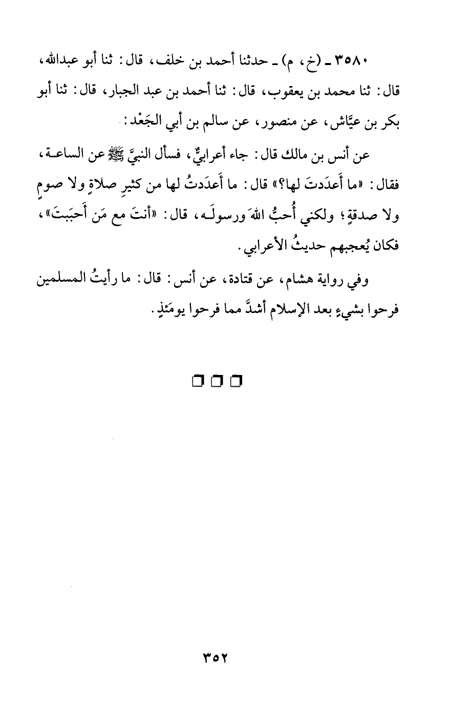 3580 - (خ، م) - حدثنا أحمد بن خلف، قال: ثنا أبو عبد الله، قال: ثنا محمد بن يعقوب، قال: ثنا أحمد بن عبد الجبار، قال: ثنا أبو بكر بن عياش، عن منصور، عن سالم بن أبي الجعد: