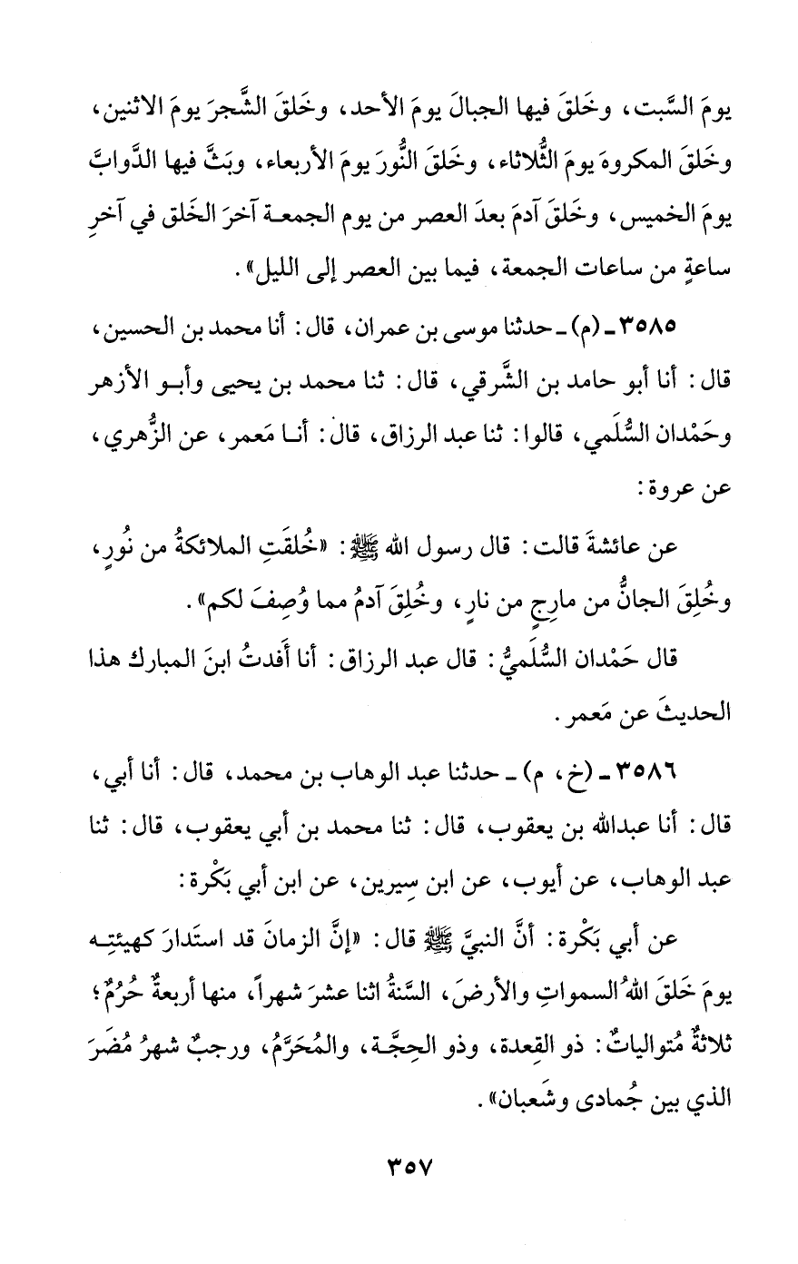 3585 - (م) - حدثنا موسى بن عمران، قال: أنا محمد بن الحسين، قال: أنا أبو حامد بن الشرقي، قال: ثنا محمد بن يحيى وأبو الأزهر وحمدان السلمي، قالوا: ثنا عبد الرزاق، قال: أنا معمر، عن الزهري، عن عروة: