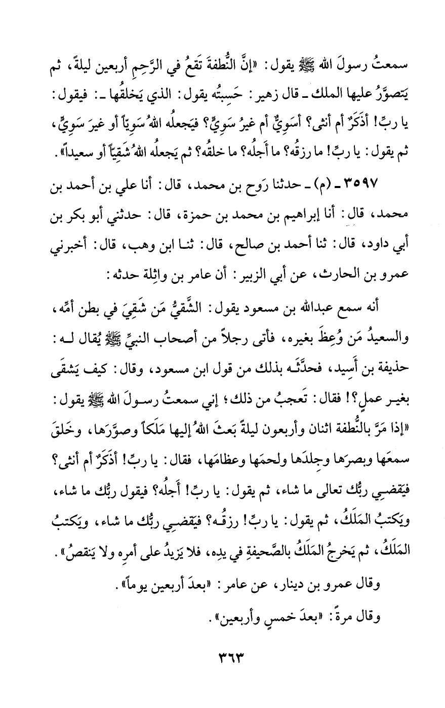 أنه سمع عبد الله بن مسعود يقول: الشقي من شقي في بطن أمه، والسعيد من وعظ بغيره، فأتى رجلا من أصحاب النبي صلى الله عليه وسلم يقال له: حذيفة بن أسيد، فحدثه بذلك من قول ابن مسعود، وقال: كيف يشقى بغير عمل؟! فقال: تعجب من ذلك؛ إني سمعت رسول الله صلى الله عليه وسلم يقول: ((إذا مر بالنطفة اثنان وأربعون ليلة بعث الله إليها ملكا وصورها، وخلق سمعها وبصرها وجلدها ولحمها وعظامها، فقال: يا رب! أذكر أم أنثى؟ فيقضي ربك تعالى ما شاء، ثم يقول: يا رب! أجله؟ فيقول ربك ما شاء، ويكتب الملك، ثم يقول: يا رب! رزقه؟ فيقضي ربك ما شاء، ويكتب الملك، ثم يخرج الملك بالصحيفة في يده، فلا يزيد على أمره ولا ينقص)).