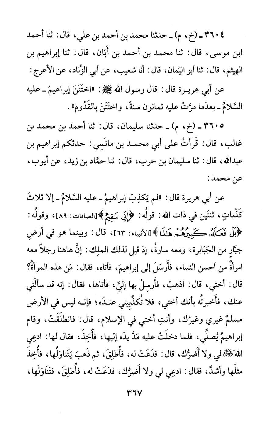 عن أبي هريرة قال: ((لم يكذب إبراهيم -عليه السلام- إلا ثلاث كذبات، ثنتين في ذات الله: قوله: {إني سقيم}، وقوله: {بل فعله كبيرهم هذا}، قال: وبينما هو في أرض جبار من الجبابرة، ومعه سارة، إذ قيل لذلك الملك: إن هاهنا رجلا معه امرأة من أحسن النساء، فأرسل إلى إبراهيم، فأتاه، فقال: من هذه المرأة؟ قال: أختي، قال: اذهب، فأرسل بها إلي، فأتاها، فقال: إنه قد سألني عنك، فأخبرته بأنك أختي، فلا تكذبيني عنده؛ فإنه ليس في الأرض مسلم غيري وغيرك، وأنت أختي في الإسلام، قال: فانطلقت، وقام إبراهيم يصلي، فلما دخلت عليه مد يده إليها، فأخذ، فقال لها: ادعي الله عز وجل لي ولا أضرك، قال: فدعت له، فأطلق، ثم ذهب يتناولها، فأخذ مثلها وأشد، فقال: ادعي لي ولا أضرك، فدعت له، فأطلق، فتناولها، #368# فأخذ مثلها أو أشد، فقال: ادعي لي ولا أضرك، فدعت له، فأطلق، فدعا لأدنى حجبته، فقال: إنك لم تأتني بإنسان؛ إنما أتيتني بشيطان، ثم أخرجها وأعطاها هاجر، فلما رآها إبراهيم من بعيد انصرف وقال: مهيم! قالت: كف الله يد الفاجر، وأخدم هاجر)).