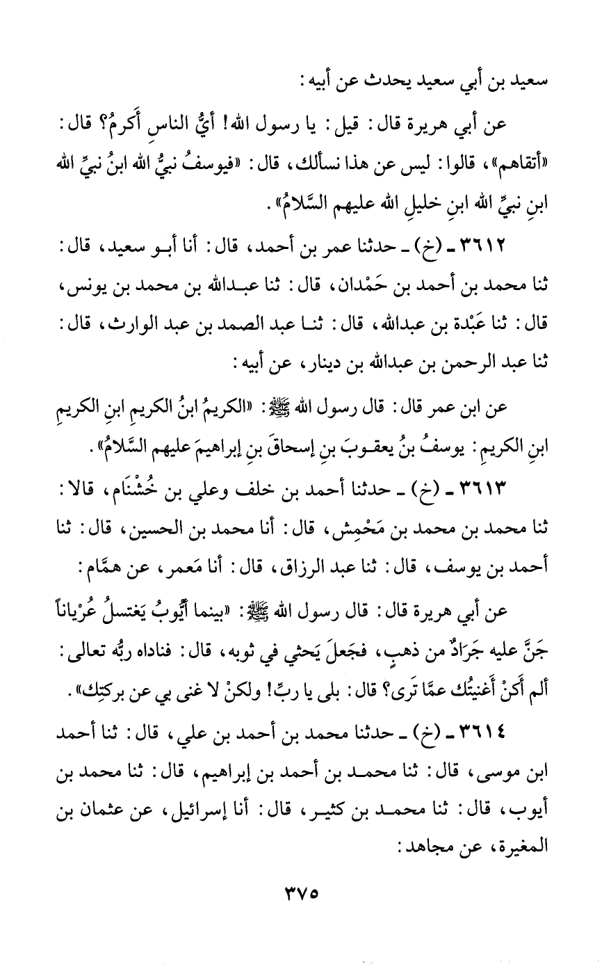 عن ابن عمر قال: قال رسول الله صلى الله عليه وسلم: ((الكريم ابن الكريم ابن الكريم ابن الكريم: يوسف بن يعقوب بن إسحاق بن إبراهيم عليهم السلام)).