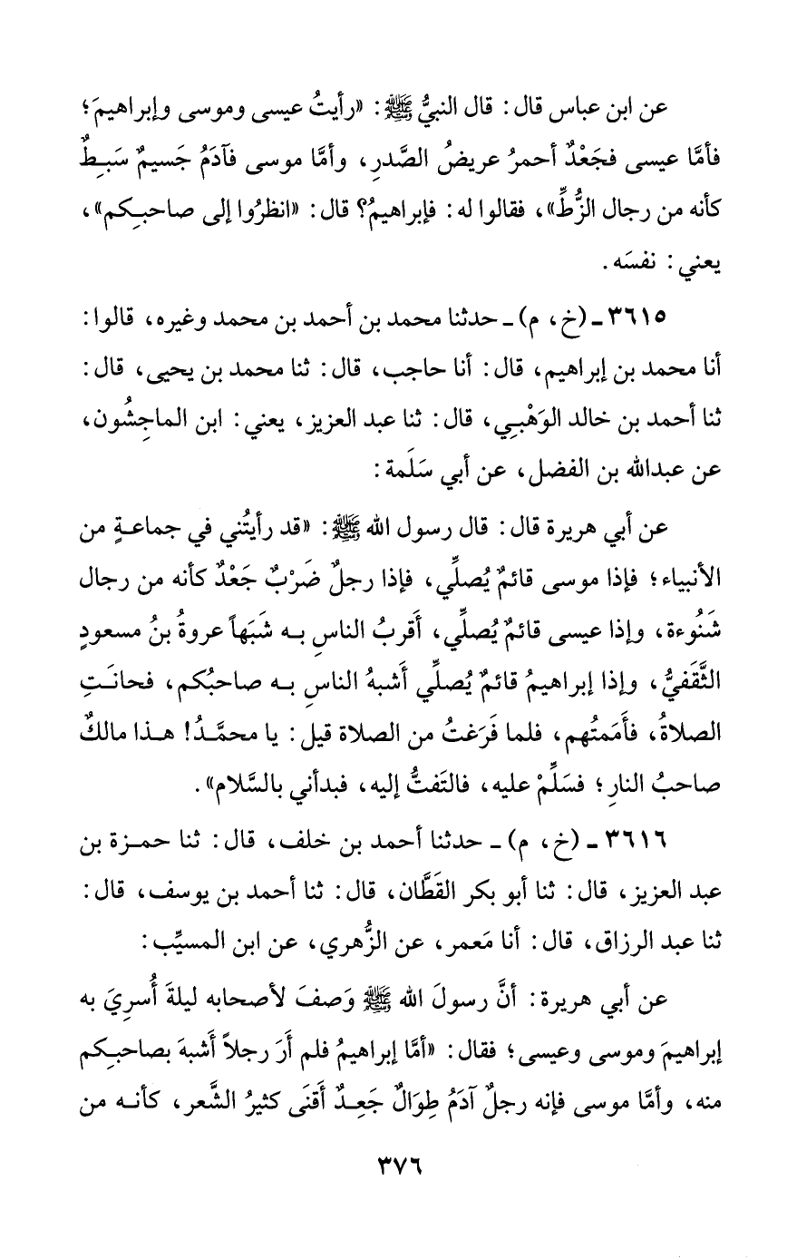 3615 - (خ، م) - حدثنا محمد بن أحمد بن محمد وغيره، قالوا: أنا محمد بن إبراهيم، قال: أنا حاجب، قال: ثنا محمد بن يحيى، قال: ثنا أحمد بن خالد الوهبي، قال: ثنا عبد العزيز، يعني: ابن الماجشون، عن عبد الله بن الفضل، عن أبي سلمة: