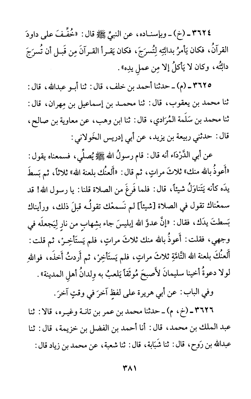 3624 - (خ) - وبإسناده، عن النبي صلى الله عليه وسلم قال: ((خفف على داود القرآن، فكان يأمر بدابته لتسرج، فكان يقرأ القرآن من قبل أن تسرج دابته، وكان لا يأكل إلا من عمل يده)).