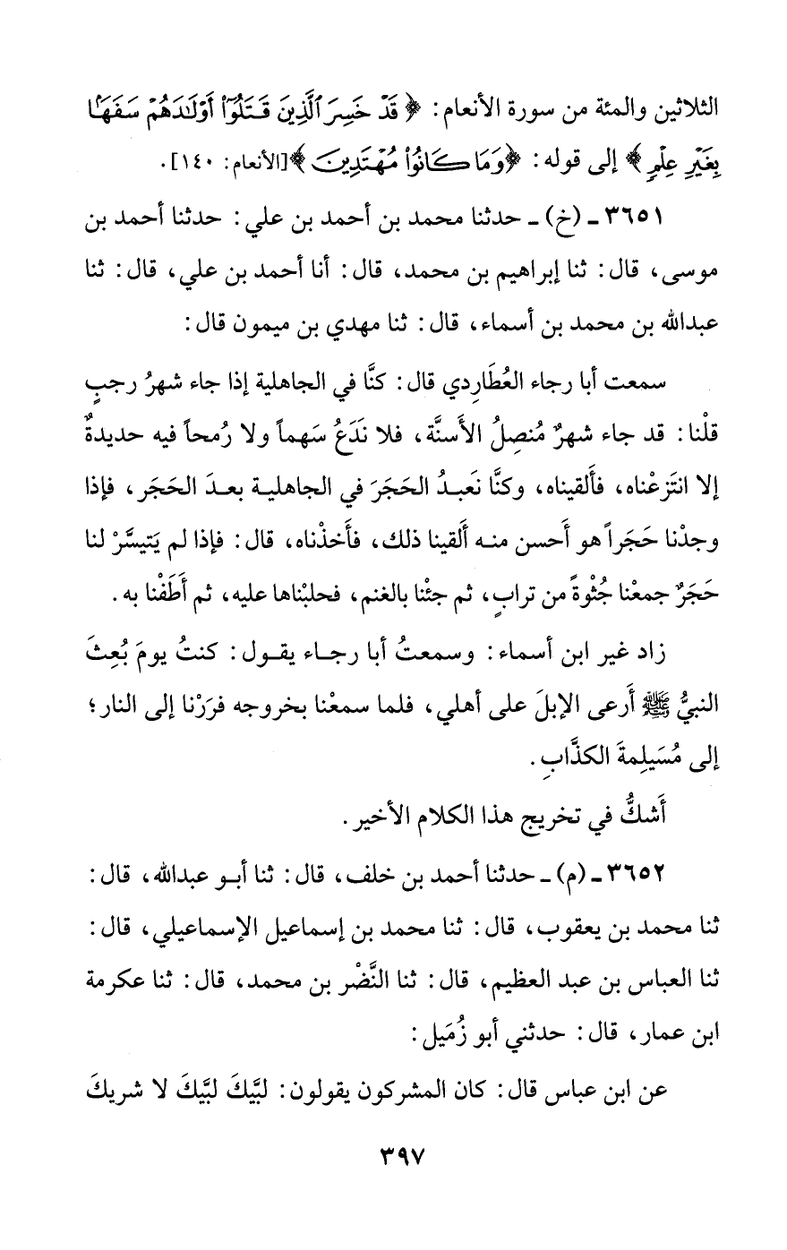سمعت أبا رجاء العطاردي قال: كنا في الجاهلية إذا جاء شهر رجب قلنا: قد جاء شهر منصل الأسنة، فلا ندع سهما ولا رمحا فيه حديدة إلا انتزعناه، فألقيناه، وكنا نعبد الحجر في الجاهلية بعد الحجر، فإذا وجدنا حجرا هو أحسن منه ألقينا ذلك، فأخذناه، قال: فإذا لم يتيسر لنا حجر جمعنا جثوة من تراب، ثم جئنا بالغنم، فحلبناها عليه، ثم أطفنا به.