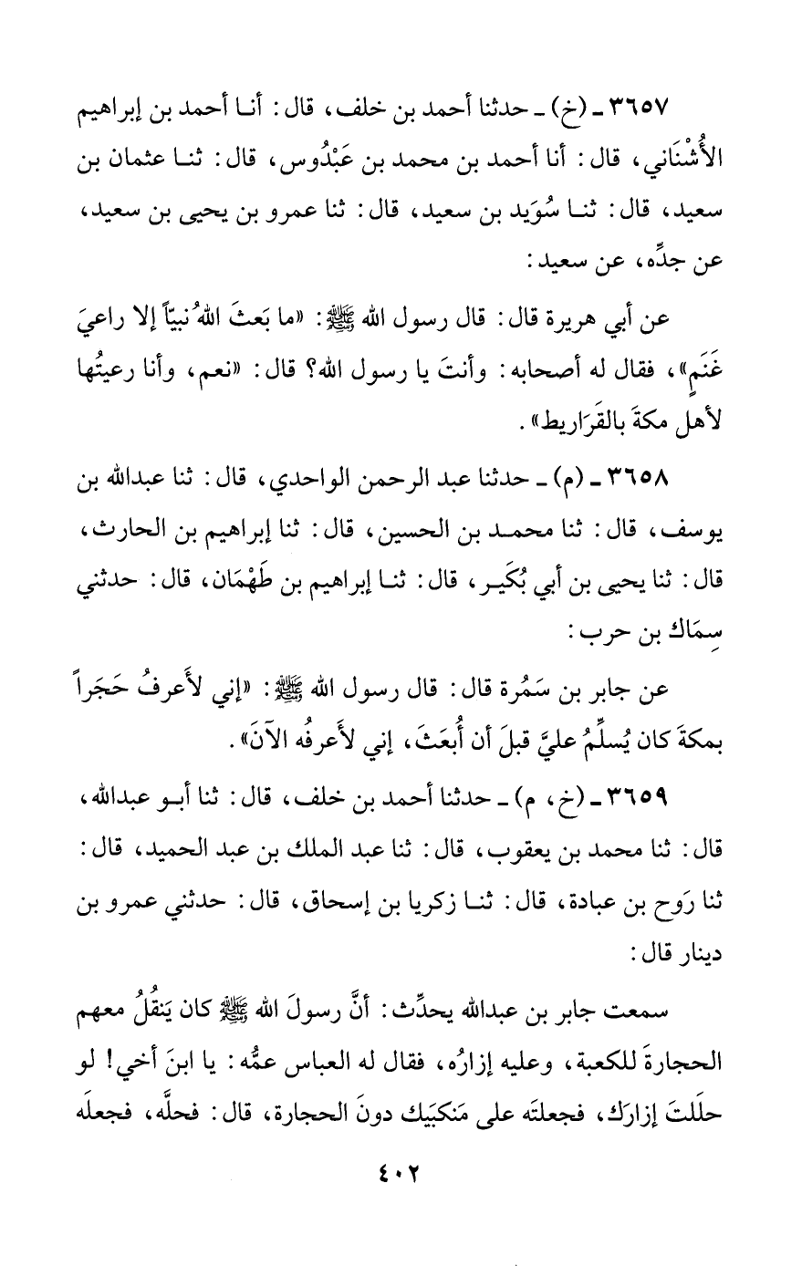 3659 - (خ، م) - حدثنا أحمد بن خلف، قال: ثنا أبو عبد الله، قال: ثنا محمد بن يعقوب، قال: ثنا عبد الملك بن عبد الحميد، قال: ثنا روح بن عبادة، قال: ثنا زكريا بن إسحاق، قال: حدثني عمرو بن دينار قال: