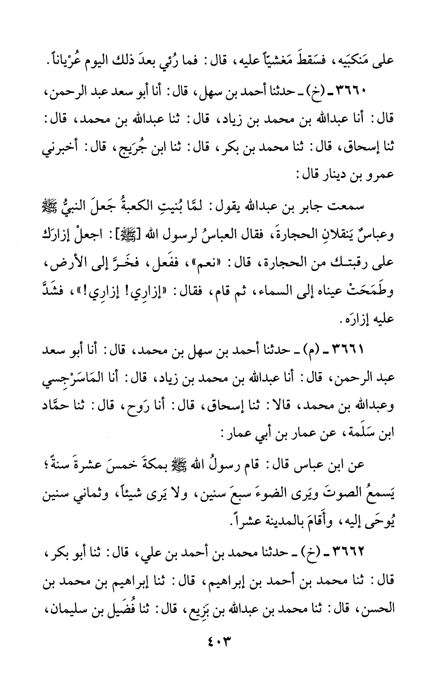 سمعت جابر بن عبد الله يقول: لما بنيت الكعبة جعل النبي صلى الله عليه وسلم وعباس ينقلان الحجارة، فقال العباس لرسول الله [صلى الله عليه وسلم]: اجعل إزارك على رقبتك من الحجارة، قال: ((نعم))، ففعل، فخر إلى الأرض، وطمحت عيناه إلى السماء، ثم قام، فقال: ((إزاري! إزاري!))، فشد عليه إزاره.