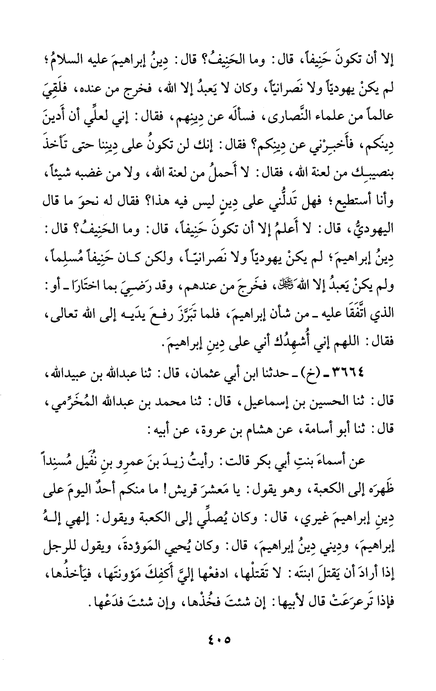 عن أسماء بنت أبي بكر قالت: رأيت زيد بن عمرو بن نفيل مسندا ظهره إلى الكعبة، وهو يقول: يا معشر قريش! ما منكم أحد اليوم على دين إبراهيم غيري، قال: وكان يصلي إلى الكعبة ويقول: إلهي إله إبراهيم، وديني دين إبراهيم، قال: وكان يحيي الموؤدة، ويقول للرجل إذا أراد أن يقتل ابنته: لا تقتلها، ادفعها إلي أكفك مؤونتها، فيأخذها، فإذا ترعرعت قال لأبيها: إن شئت فخذها، وإن شئت فدعها.