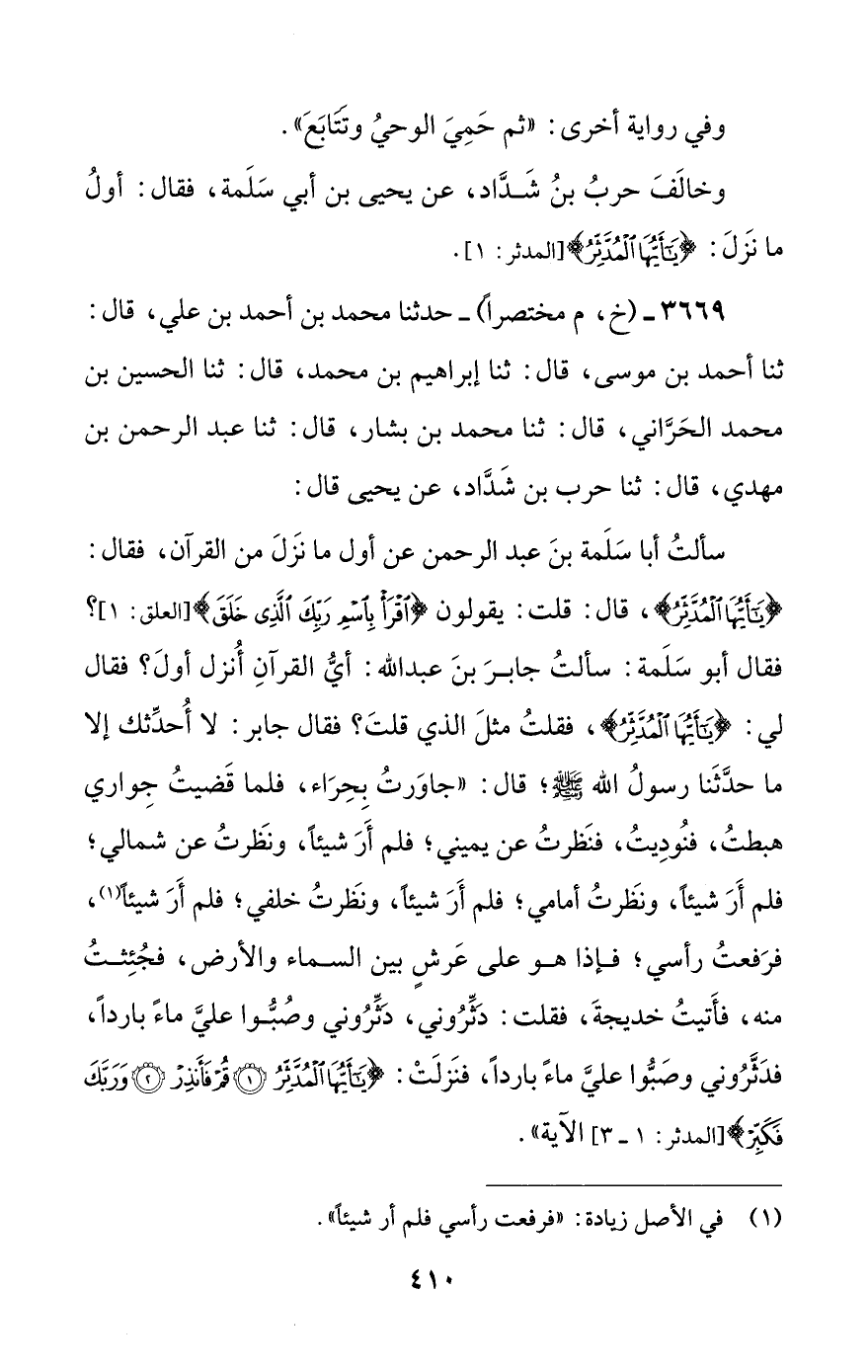 سألت أبا سلمة بن عبد الرحمن عن أول ما نزل من القرآن، فقال: {يأيها المدثر}، قال: قلت: يقولون {اقرأ باسم ربك الذي خلق}؟ فقال أبو سلمة: سألت جابر بن عبد الله: أي القرآن أنزل أول؟ فقال لي: {يأيها المدثر}، فقلت مثل الذي قلت؟ فقال جابر: لا أحدثك إلا ما حدثنا رسول الله صلى الله عليه وسلم؛ قال: ((جاورت بحراء، فلما قضيت جواري هبطت، فنوديت، فنظرت عن يميني؛ فلم أر شيئا، ونظرت عن شمالي؛ فلم أر شيئا، ونظرت أمامي؛ فلم أر شيئا، ونظرت خلفي؛ فلم أر شيئا، فرفعت رأسي؛ فإذا هو على عرش بين السماء والأرض، فجئثت منه، فأتيت خديجة، فقلت: دثروني، دثروني وصبوا علي ماء باردا، فدثروني وصبوا علي ماء باردا، فنزلت: {يأيها المدثر. قم فأنذر. وربك فكبر} الآية)).