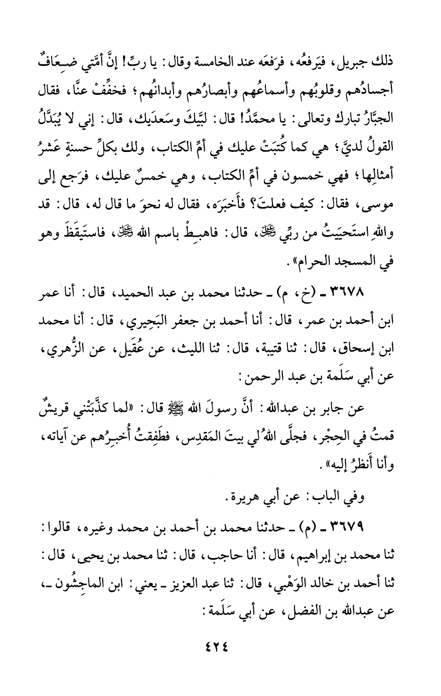 3678 - (خ، م) - حدثنا محمد بن عبد الحميد، قال: أنا عمر بن أحمد بن عمر، قال: أنا أحمد بن جعفر البحيري، قال: أنا محمد بن إسحاق، قال: ثنا قتيبة، قال: ثنا الليث، عن عقيل، عن الزهري، عن أبي سلمة بن عبد الرحمن: