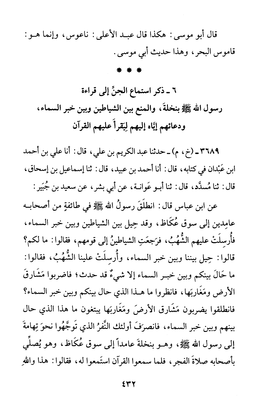 عن ابن عباس قال: انطلق رسول الله صلى الله عليه وسلم في طائفة من أصحابه عامدين إلى سوق عكاظ، وقد حيل بين الشياطين وبين خبر السماء، فأرسلت عليهم الشهب، فرجعت الشياطين إلى قومهم، فقالوا: ما لكم؟ قالوا: حيل بيننا وبين خبر السماء، وأرسلت علينا الشهب، فقالوا: ما حال بينكم وبين خبر السماء إلا شيء قد حدث؛ فاضربوا مشارق الأرض ومغاربها، فانظروا ما هذا الذي حال بينكم وبين خبر السماء؟ فانطلقوا يضربون مشارق الأرض ومغاربها يبتغون ما هذا الذي حال بينهم وبين خبر السماء، فانصرف أولئك النفر الذي توجهوا نحو تهامة إلى رسول الله صلى الله عليه وسلم، وهو بنخلة عامدا إلى سوق عكاظ، وهو يصلي بأصحابه صلاة الفجر، فلما سمعوا القرآن استمعوا له، فقالوا: هذا والله #433# الذي حال بينكم وبين خبر السماء، فهنالك حين رجعوا إلى قومهم، فقالوا: يا قومنا! {إنا سمعنا قرآنا عجبا. يهدي إلى الرشد فآمنا به ولن نشرك بربنا أحدا}، فأنزل الله عز وجل: {قل أوحي إلي أنه استمع نفر من الجن}؛ وإنما أوحي إليه قول الجن.