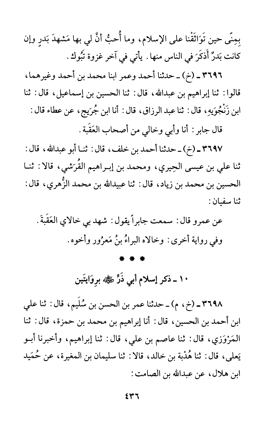 3698 - (خ، م) - حدثنا عمر بن الحسن بن سليم، قال: ثنا علي بن أحمد بن الحسين، قال: أنا إبراهيم بن محمد بن حمزة، قال: ثنا المروزي، قال: ثنا عاصم بن علي، قال: ثنا إبراهيم، وأخبرنا أبو يعلى، قال: ثنا هدبة بن خالد، قالا: ثنا سليمان بن المغيرة، عن حميد بن هلال، عن عبد الله بن الصامت: