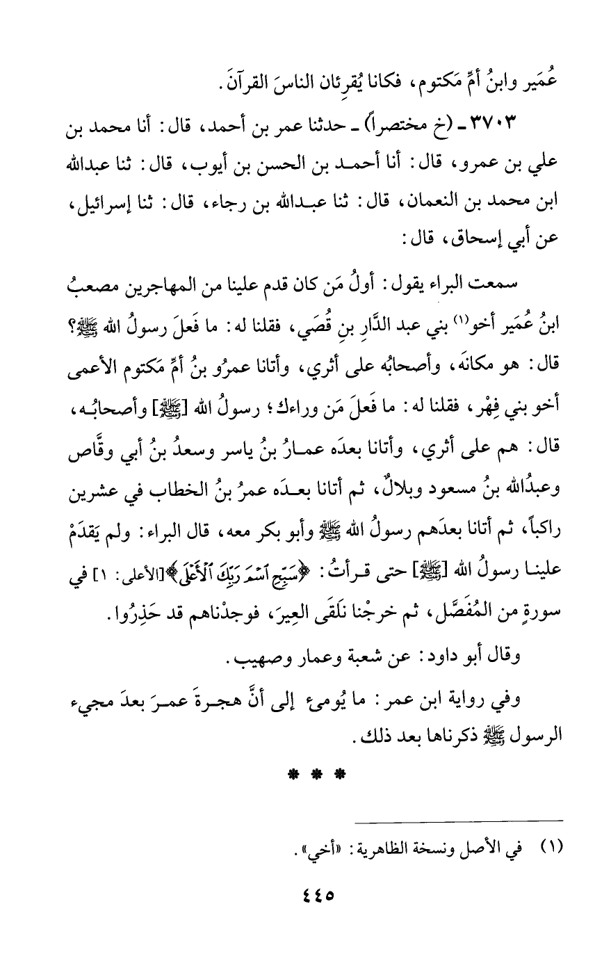 3703 - (خ مختصرا) - حدثنا عمر بن أحمد، قال: أنا محمد بن علي بن عمرو، قال: أنا أحمد بن الحسن بن أيوب، قال: ثنا عبد الله بن محمد بن النعمان، قال: ثنا عبد الله بن رجاء، قال: ثنا إسرائيل، عن أبي إسحاق، قال: