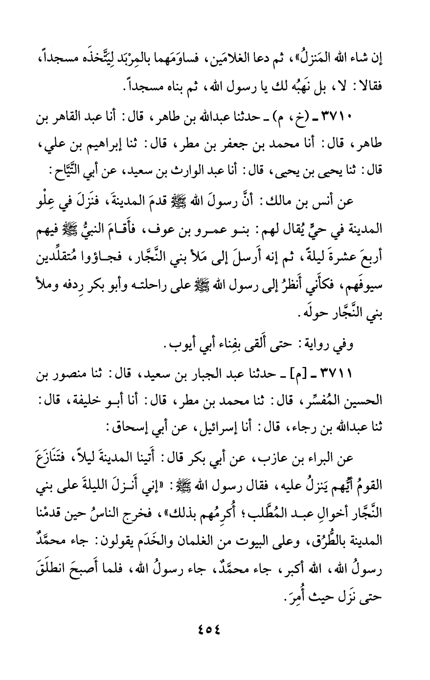 عن البراء بن عازب، عن أبي بكر قال: أتينا المدينة ليلا، فتنازع القوم أيهم ينزل عليه، فقال رسول الله صلى الله عليه وسلم: ((إني أنزل الليلة على بني النجار أخوال عبد المطلب؛ أكرمهم بذلك))، فخرج الناس حين قدمنا المدينة بالطرق، وعلى البيوت من الغلمان والخدم يقولون: جاء محمد رسول الله، الله أكبر، جاء محمد، جاء رسول الله، فلما أصبح انطلق حتى نزل حيث أمر.