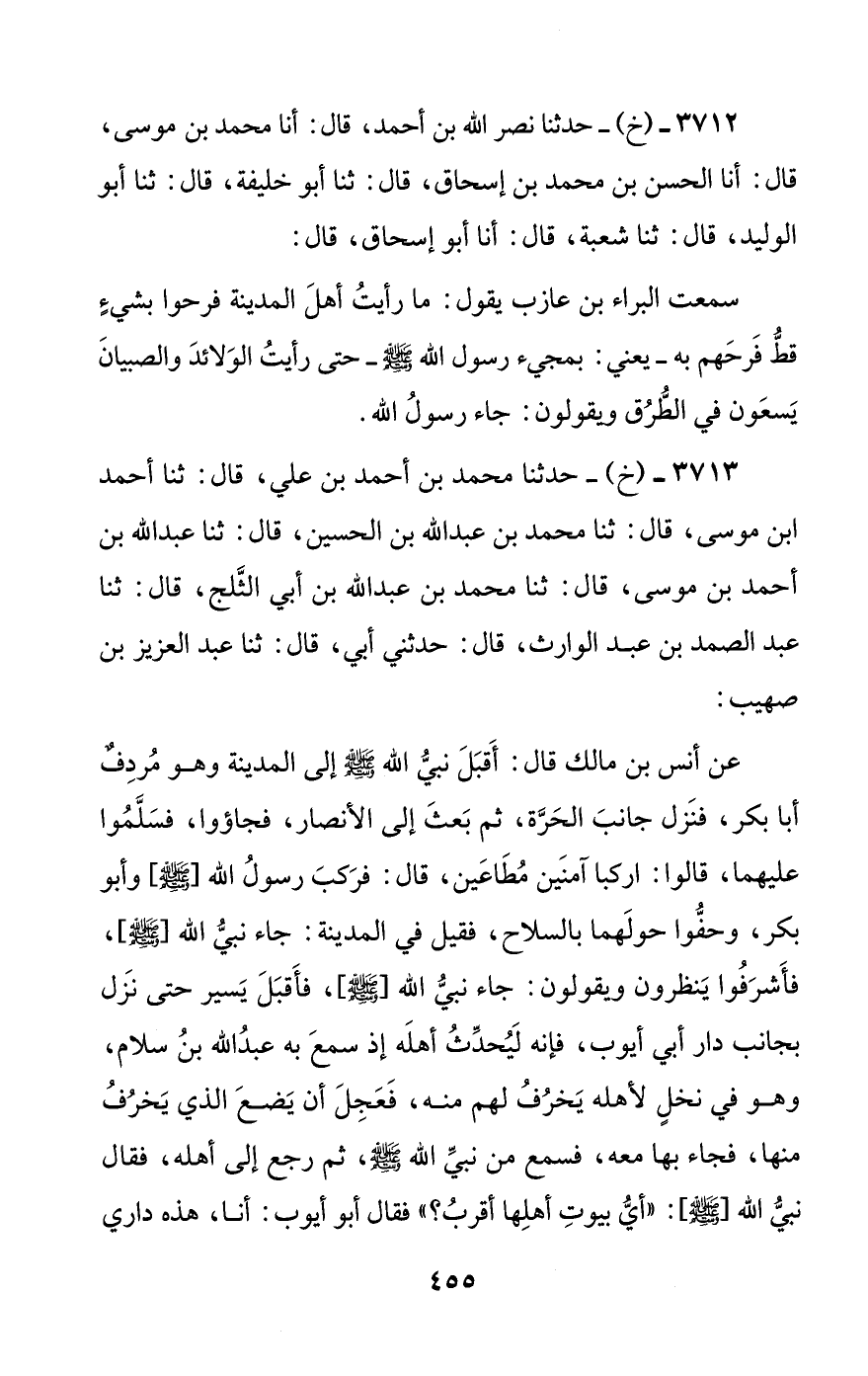 3712 - (خ) - حدثنا نصر الله بن أحمد، قال: أنا محمد بن موسى، قال: أنا الحسن بن محمد بن إسحاق، قال: ثنا أبو خليفة، قال: ثنا أبو الوليد، قال: ثنا شعبة، قال: أنا أبو إسحاق، قال: