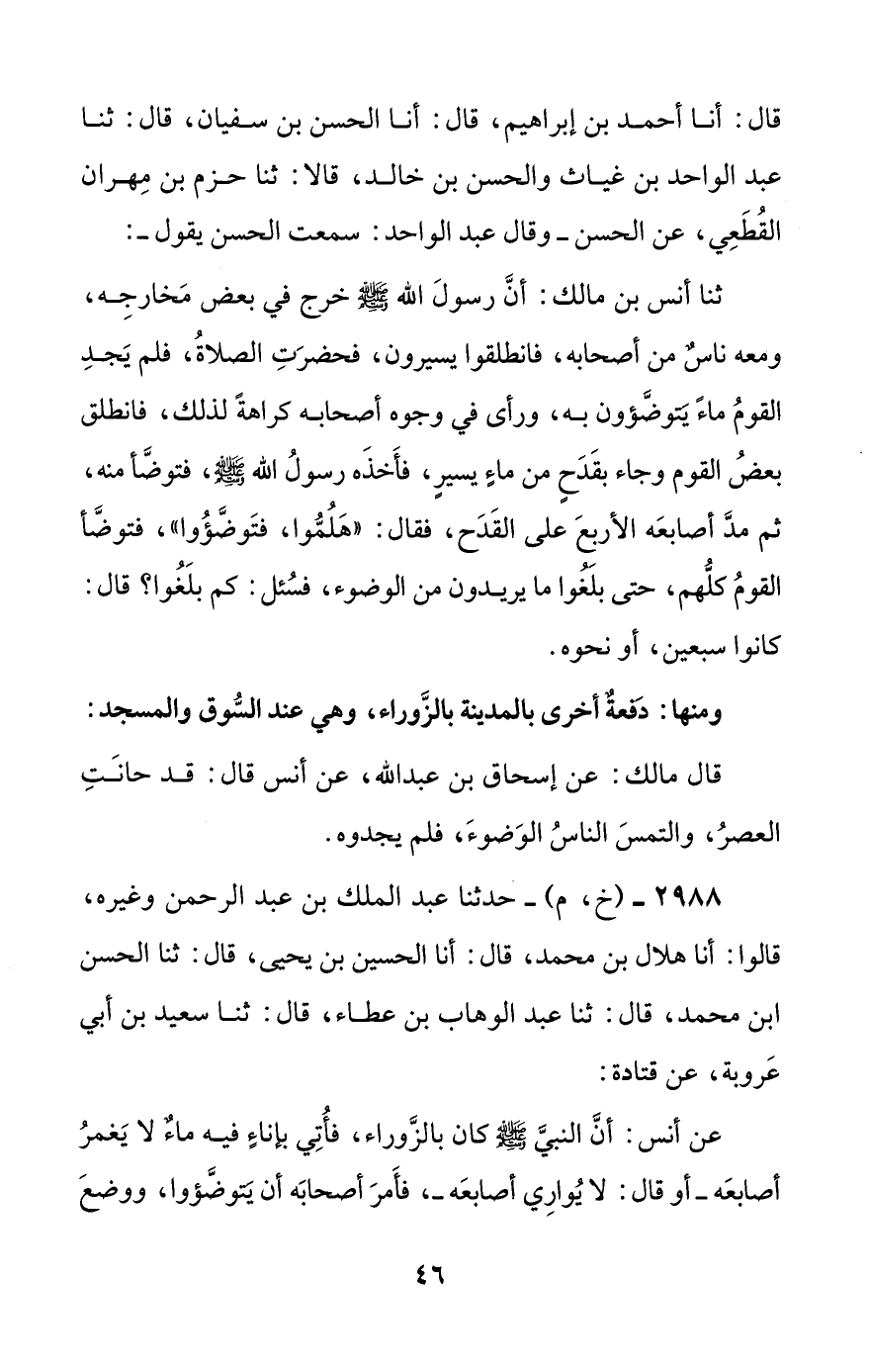 2988 - (خ، م) - حدثنا عبد الملك بن عبد الرحمن وغيره، قالوا: أنا هلال بن محمد، قال: أنا الحسين بن يحيى، قال: ثنا الحسن بن محمد، قال: ثنا عبد الوهاب بن عطاء، قال: ثنا سعيد بن أبي عروبة، عن قتادة: عن أنس: أن النبي صلى الله عليه وسلم كان بالزوراء، فأتي بإناء فيه ماء لا يغمر أصابعه -أو قال: لا يواري أصابعه-، فأمر أصحابه أن يتوضؤوا، ووضع #47# كفه في الماء، فجعلنا نرى الماء ينبع من بين أصابعه وأطراف أصابعه، حتى توضأ القوم، قلت لأنس: كم كنتم؟ قال: ثلاثمئة، أو زهاء ثلاثمئة.