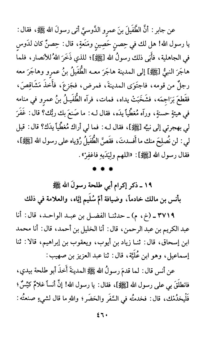 3719 - (خ، م) - حدثنا الفضل بن عبد الواحد، قال: أنا عبد الكريم بن عبد الرحمن، قال: أنا الخليل بن أحمد، قال: أنا محمد بن إسحاق، قال: ثنا زياد بن أيوب، ويعقوب بن إبراهيم، قالا: ثنا إسماعيل، وهو ابن علية، قال: ثنا عبد العزيز بن صهيب: