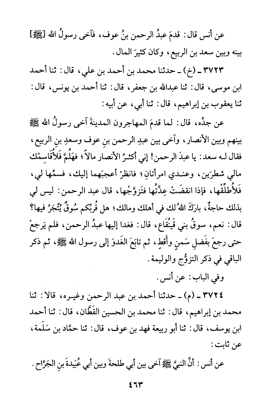 عن جده، قال: لما قدم المهاجرون المدينة آخى رسول الله صلى الله عليه وسلم بينهم وبين الأنصار، وآخى بين عبد الرحمن بن عوف وسعد بن الربيع، فقال له سعد: يا عبد الرحمن! إني أكثر الأنصار مالا؛ فهلم فلأقاسمك مالي شطرين، وعندي امرأتان؛ فانظر أعجبهما إليك، فسمها لي، فلأطلقها، فإذا انقضت عدتها فتزوجها، قال عبد الرحمن: ليس لي بذلك حاجة، بارك الله لك في أهلك ومالك؛ هل قربكم سوق يتجر فيها؟ قال: نعم، سوق بني قينقاع، قال: فغدا إليها عبد الرحمن، فلم يرجع حتى رجع بفضل سمن وأقط، ثم تابع الغدو إلى رسول الله صلى الله عليه وسلم، ثم ذكر الباقي في ذكر التزوج والوليمة.