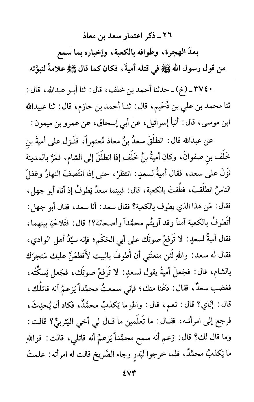 [26] ذكر اعتمار سعد بن معاذ بعد الهجرة، وطوافه بالكعبة، وإخباره بما سمع من قول رسول الله صلى الله عليه وسلم في قتله أمية، فكان كما قال صلى الله عليه وسلم علامة لنبوته