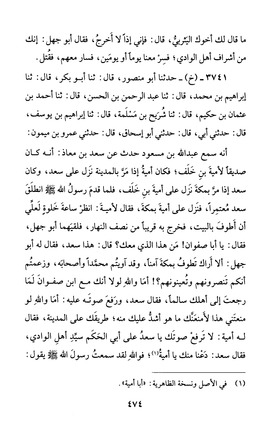 أنه سمع عبد الله بن مسعود حدث عن سعد بن معاذ: أنه كان صديقا لأمية بن خلف؛ فكان أمية إذا مر بالمدينة نزل على سعد، وكان سعد إذا مر بمكة نزل على أمية بن خلف، فلما قدم رسول الله صلى الله عليه وسلم انطلق سعد معتمرا، فنزل على أمية بمكة، فقال لأمية: انظر ساعة خلوة لعلي أن أطوف بالبيت، فخرج به قريبا من نصف النهار، فلقيهما أبو جهل، فقال: يا أبا صفوان! من هذا الذي معك؟ قال: هذا سعد، فقال له أبو جهل: ألا أراك تطوف بمكة آمنا، وقد آويتم محمدا وأصحابه، وزعمتم أنكم تنصرونهم وتعينونهم؟! أما والله لولا أنك مع ابن صفوان لما رجعت إلى أهلك سالما، فقال سعد، ورفع صوته عليه: أما والله لو منعتني هذا لأمنعنك ما هو أشد عليك منه؛ طريقك على المدينة، فقال له أمية: لا ترفع صوتك يا سعد على أبي الحكم سيد أهل الوادي، فقال سعد: دعنا منك يا أمية؛ فوالله لقد سمعت رسول الله صلى الله عليه وسلم يقول: #475# إنهم قاتلوك، قال: بمكة، قال: لا أدري، ففزع لذلك أمية فزعا شديدا، فلما رجع أمية إلى أهله، قال: يا أم صفوان! ألم تري إلى ما قال لي سعد؟ قالت: وما قال لك؟ قال: زعم أن محمدا قال: إنه قاتلي، فقلت: بمكة؟ فقال: لا أدري، فقال أمية: والله لا أخرج من مكة، فلما كان يوم بدر استنفر أبو جهل الناس، فقال: أدركوا عيركم، فكره أمية أن يخرج، فأتاه أبو جهل، فقال: يا أبا صفوان! إنك متى يراك الناس قد تخلفت، وأنت سيد أهل الوادي تخلفوا معك، فلم يزل به أبو جهل حتى قال: أما إذ غلبتني فوالله لأشترين أجود بعير بمكة، ثم قال أمية: يا أم صفوان! جهزيني، فقالت له: يا أبا صفوان! وقد نسيت ما قال لك أخوك اليثربي؟ قال: لا، وما أريد أن أجوز معهم إلا قريبا، فلما خرج قال: لا ينزلن أحد منزلا إلا عقل بعيره، فلم يزل بذلك حتى قتله الله.