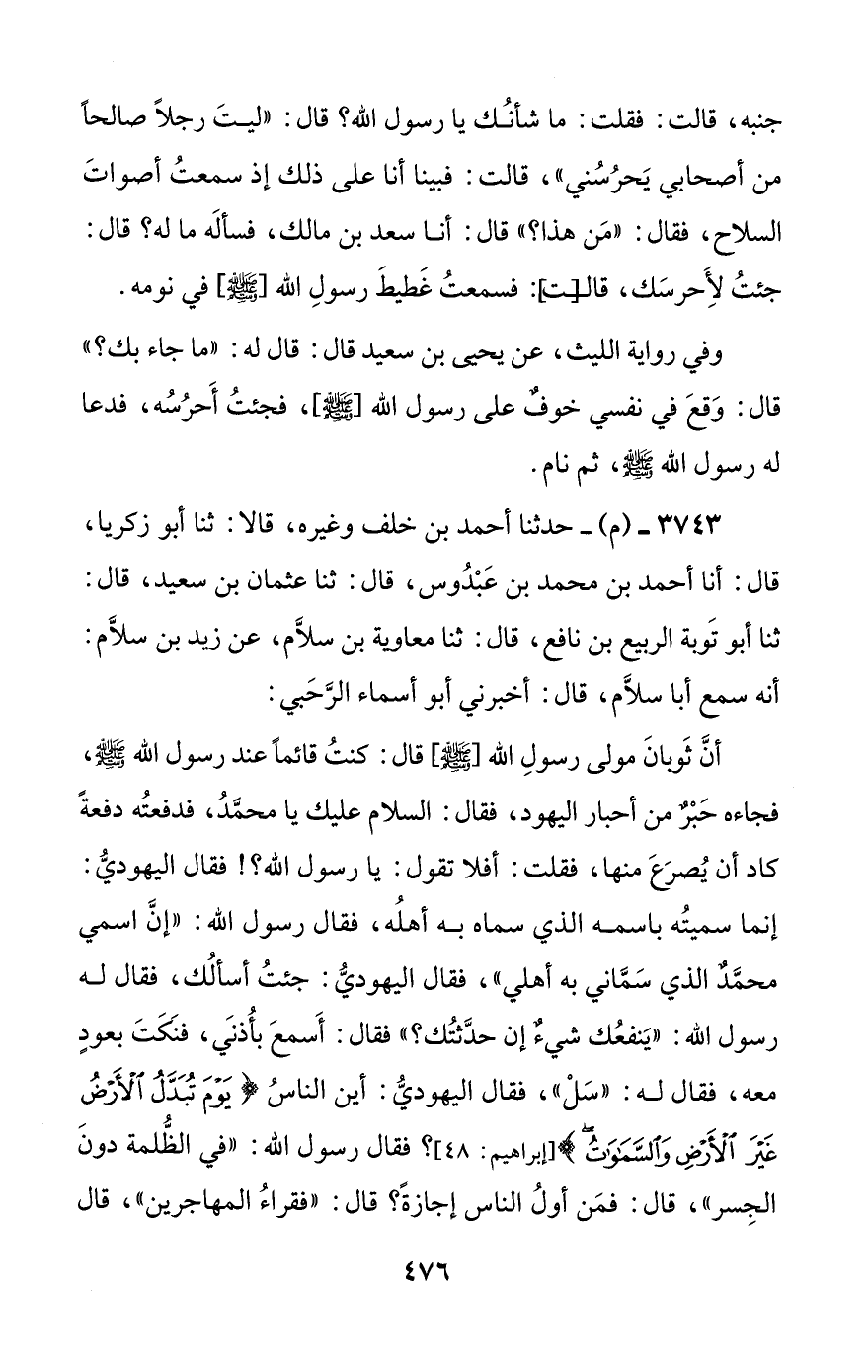 أن ثوبان مولى رسول الله [صلى الله عليه وسلم] قال: كنت قائما عند رسول الله صلى الله عليه وسلم، فجاءه حبر من أحبار اليهود، فقال: السلام عليك يا محمد، فدفعته دفعة كاد أن يصرع منها، فقلت: أفلا تقول: يا رسول الله؟! فقال اليهودي: إنما سميته باسمه الذي سماه به أهله، فقال رسول الله: ((إن اسمي محمد الذي سماني به أهلي))، فقال اليهودي: جئت أسألك، فقال له رسول الله: ((ينفعك شيء إن حدثتك؟)) فقال: أسمع بأذني، فنكت بعود معه، فقال له: ((سل))، فقال اليهودي: أين الناس {يوم تبدل الأرض غير الأرض والسموات}؟ فقال رسول الله: ((في الظلمة دون الجسر))، قال: فمن أول الناس إجازة؟ قال: ((فقراء المهاجرين))، قال #477# اليهودي: فما تحفتهم حين يدخلون الجنة؟ قال: ((زيادة كبد نون))، قال: فما غذاؤهم على إثرها؟ قال: ((ينحر لهم ثور الجنة الذي يأكل من أطرافها))، قال: فما شرابهم عليه؟ قال: ((من عين فيها تسمى: سلسبيلا))، قال: صدقت، قال: وجئت أسألك عن شيء لا يعلمه أحد من أهل الأرض إلا نبي أو رجل أو رجلان، قال: ((ينفعك إن حدثتك؟)) قال: أسمع بأذني، قال: جئت أسألك عن الولد، قال: ((ماء الرجل أبيض، وماء المرأة أصفر، فإذا اجتمعا، فعلا مني الرجل مني المرأة أذكر بإذن الله، وإذا علا مني المرأة مني الرجل آنث بإذن الله))، فقال اليهودي: لقد صدقت، وإنك لنبي، ثم انصرف، فقال رسول الله: ((لقد سألني هذا عن الذي سألني عنه، وما أعلم شيئا منه؛ حتى آتاني الله تعالى به)).