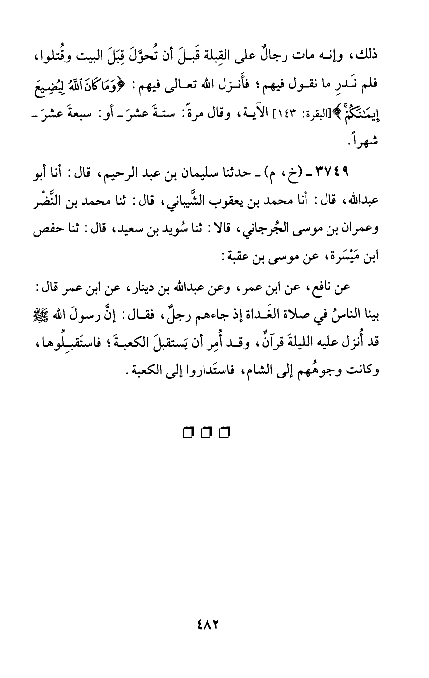 3749 - (خ، م) - حدثنا سليمان بن عبد الرحيم، قال: أنا أبو عبد الله، قال: أنا محمد بن يعقوب الشيباني، قال: ثنا محمد بن النضر وعمران بن موسى الجرجاني، قالا: ثنا سويد بن سعيد، قال: ثنا حفص بن ميسرة، عن موسى بن عقبة: